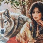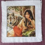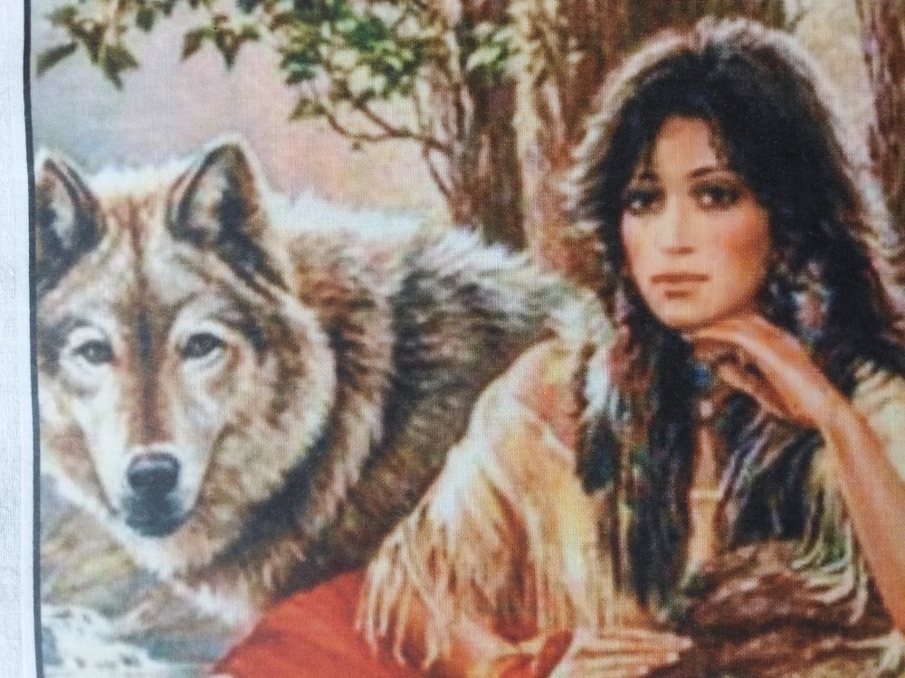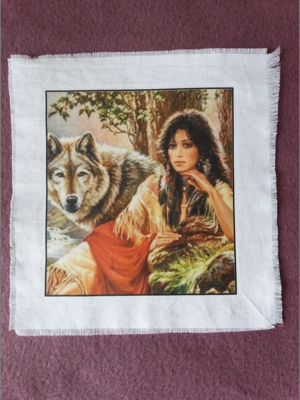 Illustration d'une jeune indienne regardant au loin, assise près de son loup, transférée sur tissu coton blanc.