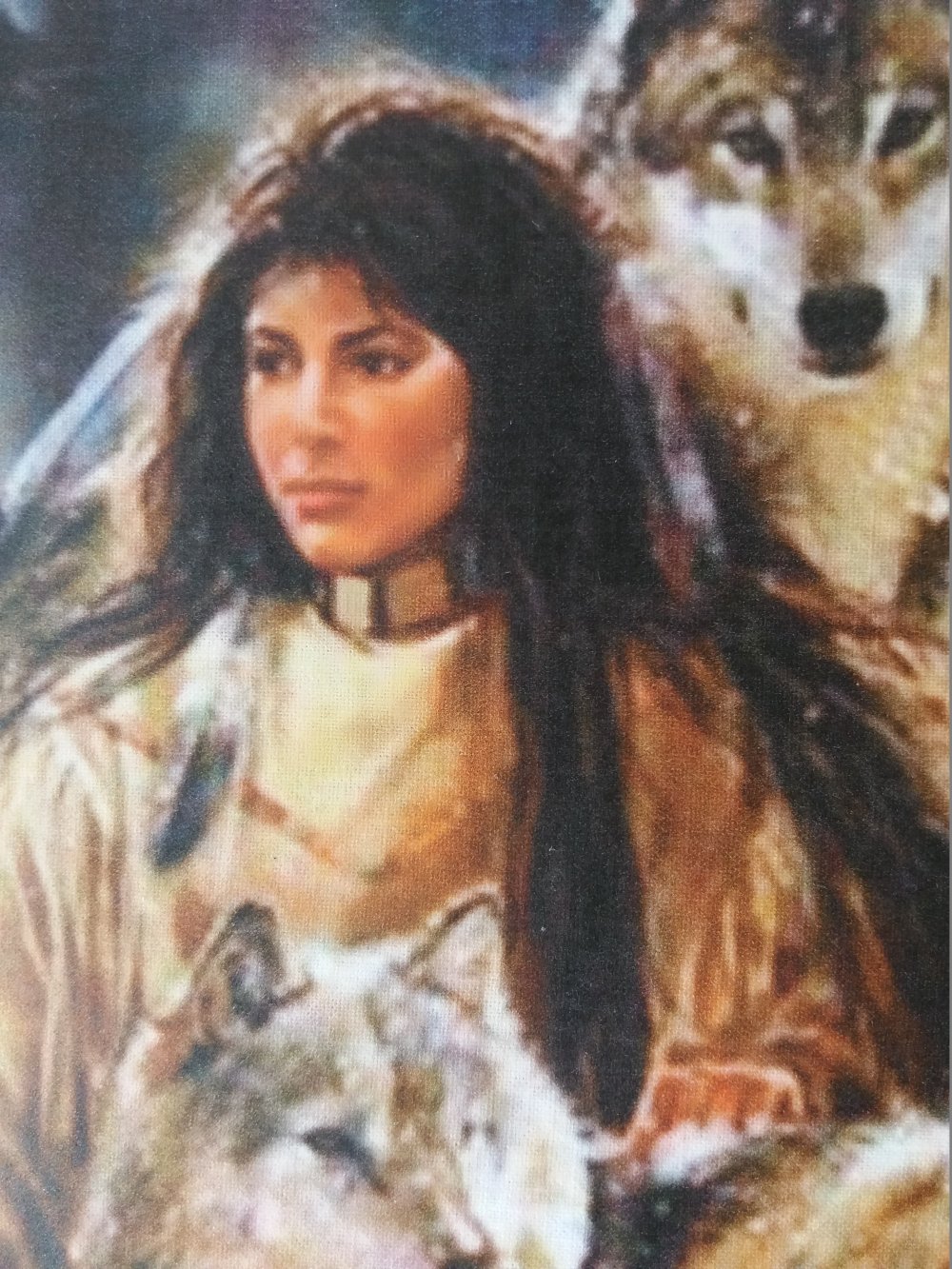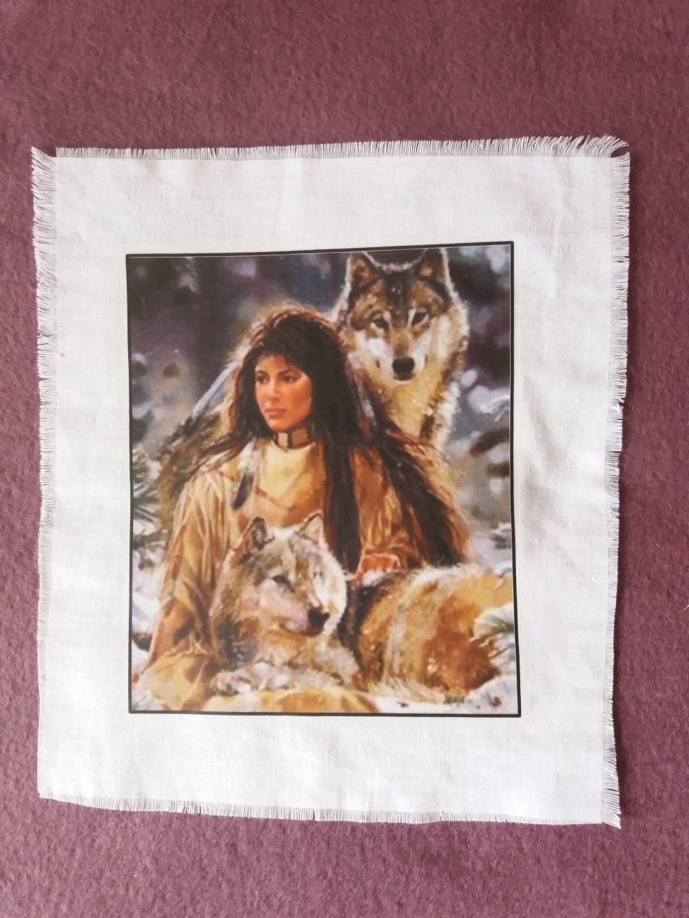 Illustration amérindien et loups transférée sur coton blanc