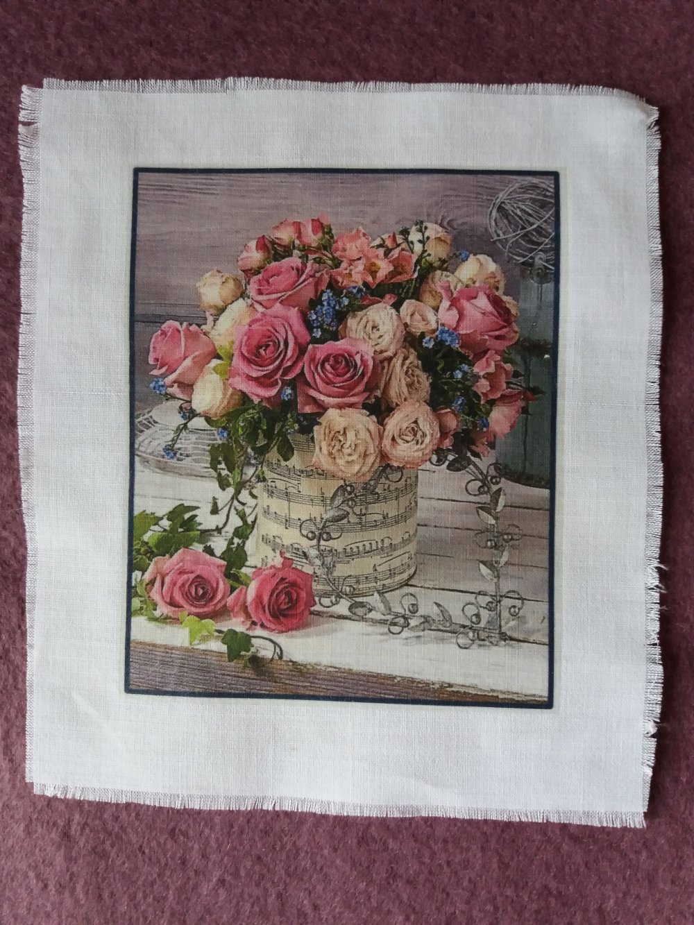 Illustration d'un bouquet shabby transféré sur tissu en coton blanc cassé