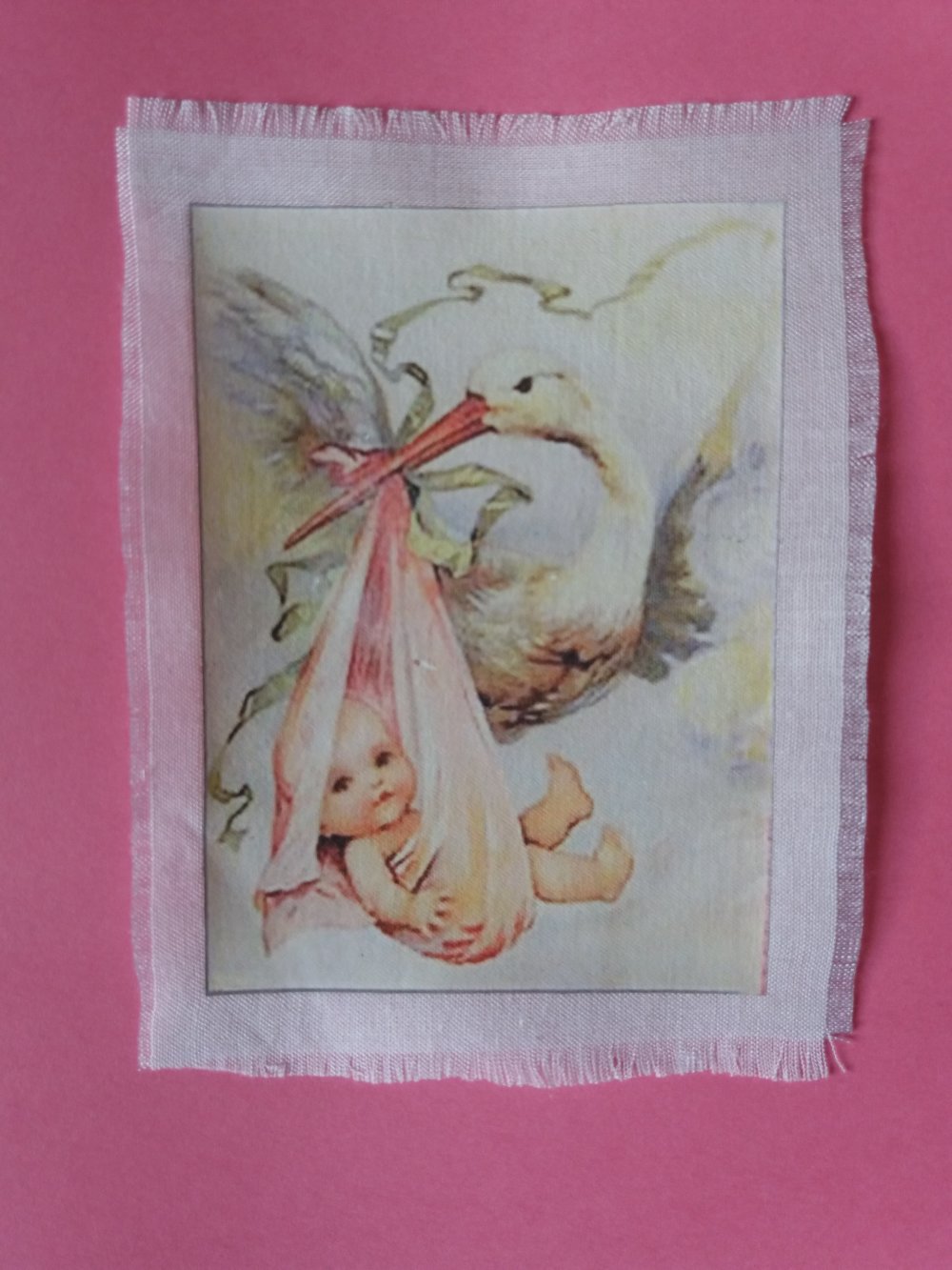 Transfert d'une image symbolisant l'arrivée, dans la famille, d'un bébé. Il s'agit ici d'une petite fille. La cigogne tient dans son bec un linge rose avec la petite merveille. L'illustration est transférée sur un tissu fin blanc écru.