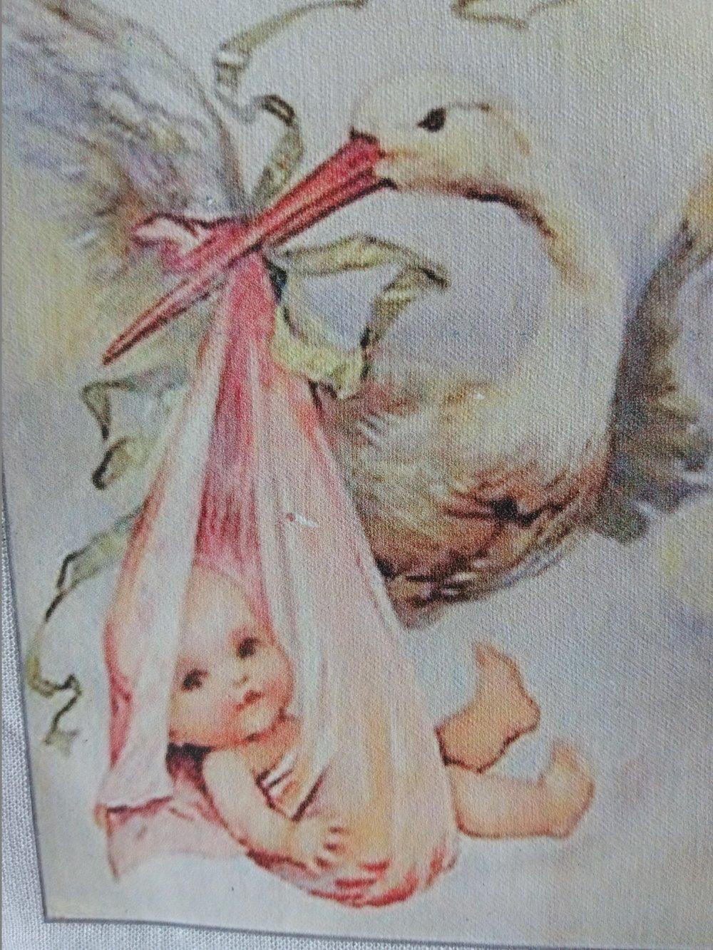 Illustration ancienne dune cigogne avec bébé transférée sur tissu fin coton blanc