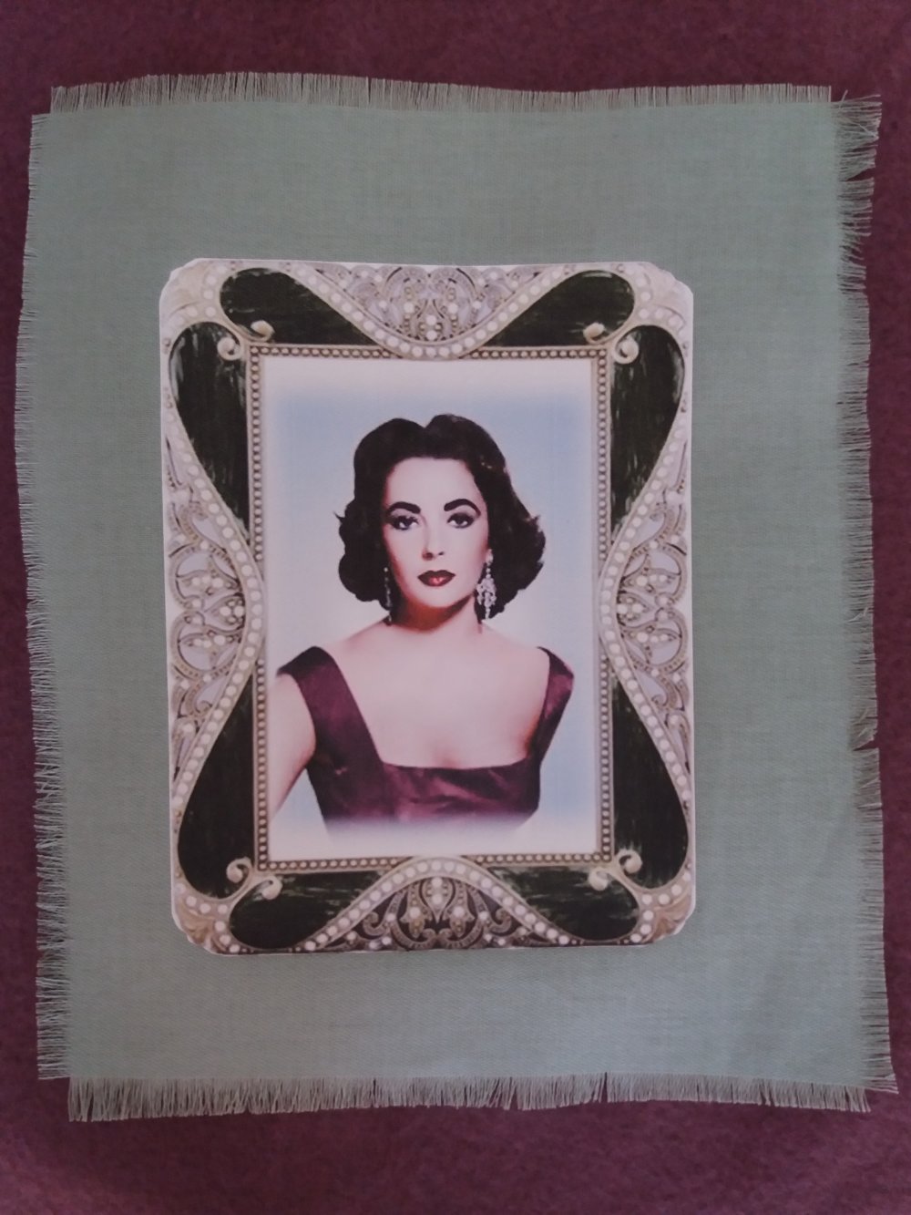 Jolie illustration d'Elisabeth Taylor, dans un cadre luxueux, transférée sur un tissu en coton couleur verte. Un superbe portrait où transparaît toute la fragilité et tout le mystère de cette magnifique actrice.