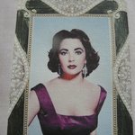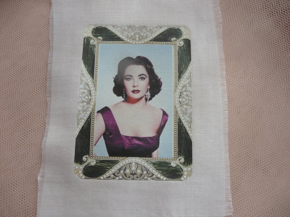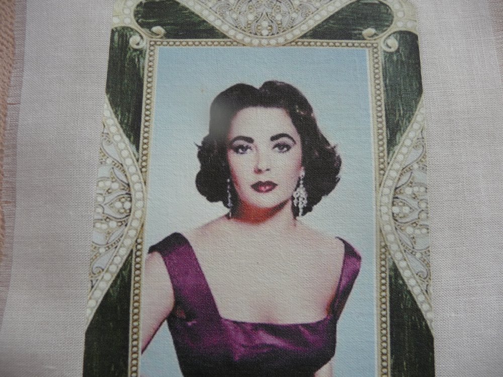 Jolie illustration d'Elisabeth Taylor, dans un cadre luxueux, transférée sur un tissu en coton fin écru. Un superbe portrait où transparaît toute la fragilité de cette magnifique actrice.