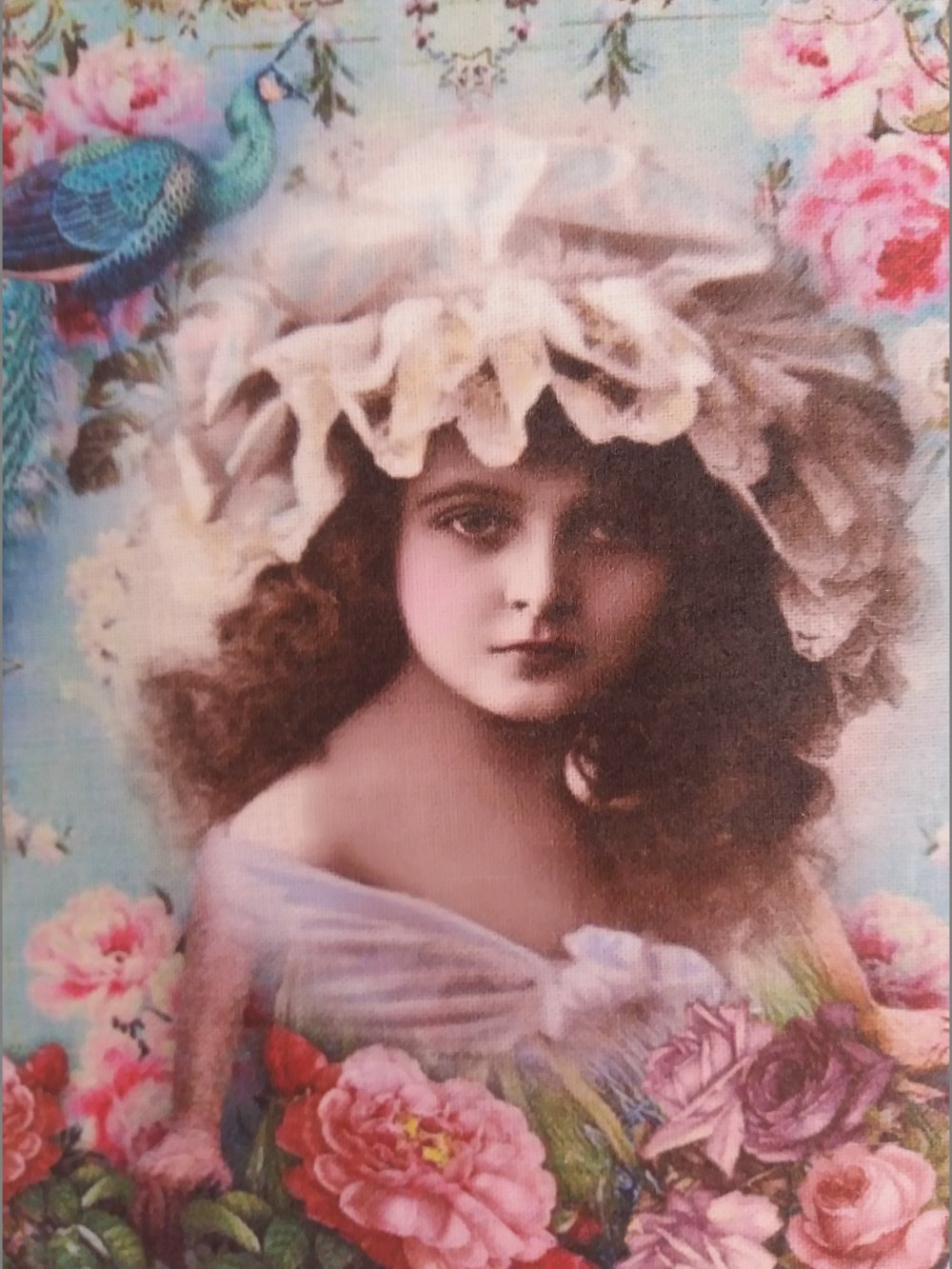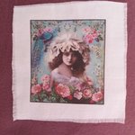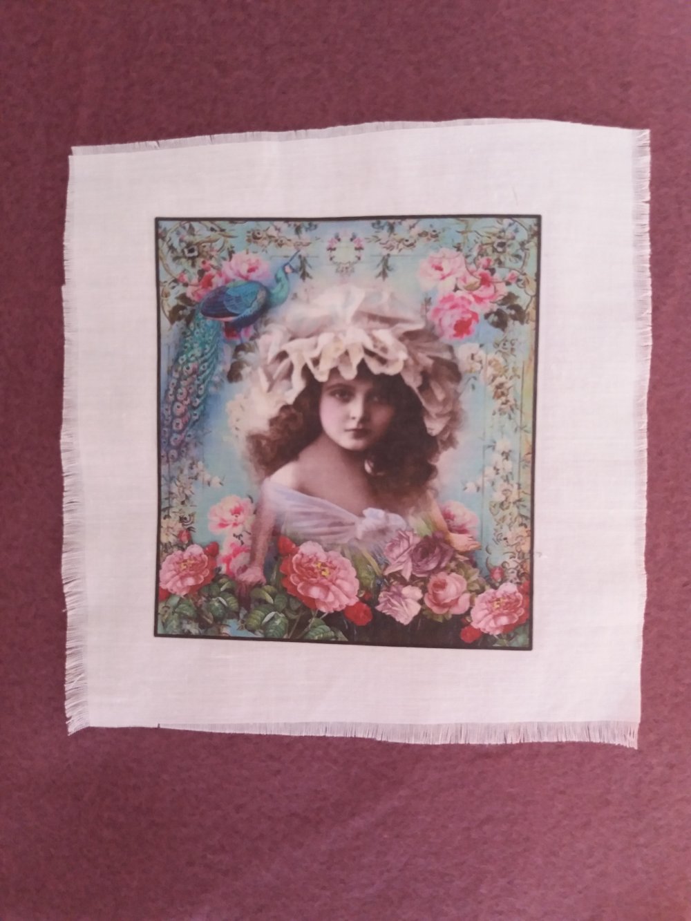 Illustration d'une fillette rétro entourée de fleurs ,décor onirique, romantique, transférée sur un coton blanc. Aspect légèrement plastifié (le transfert laisse une fine pellicule sur l'image).