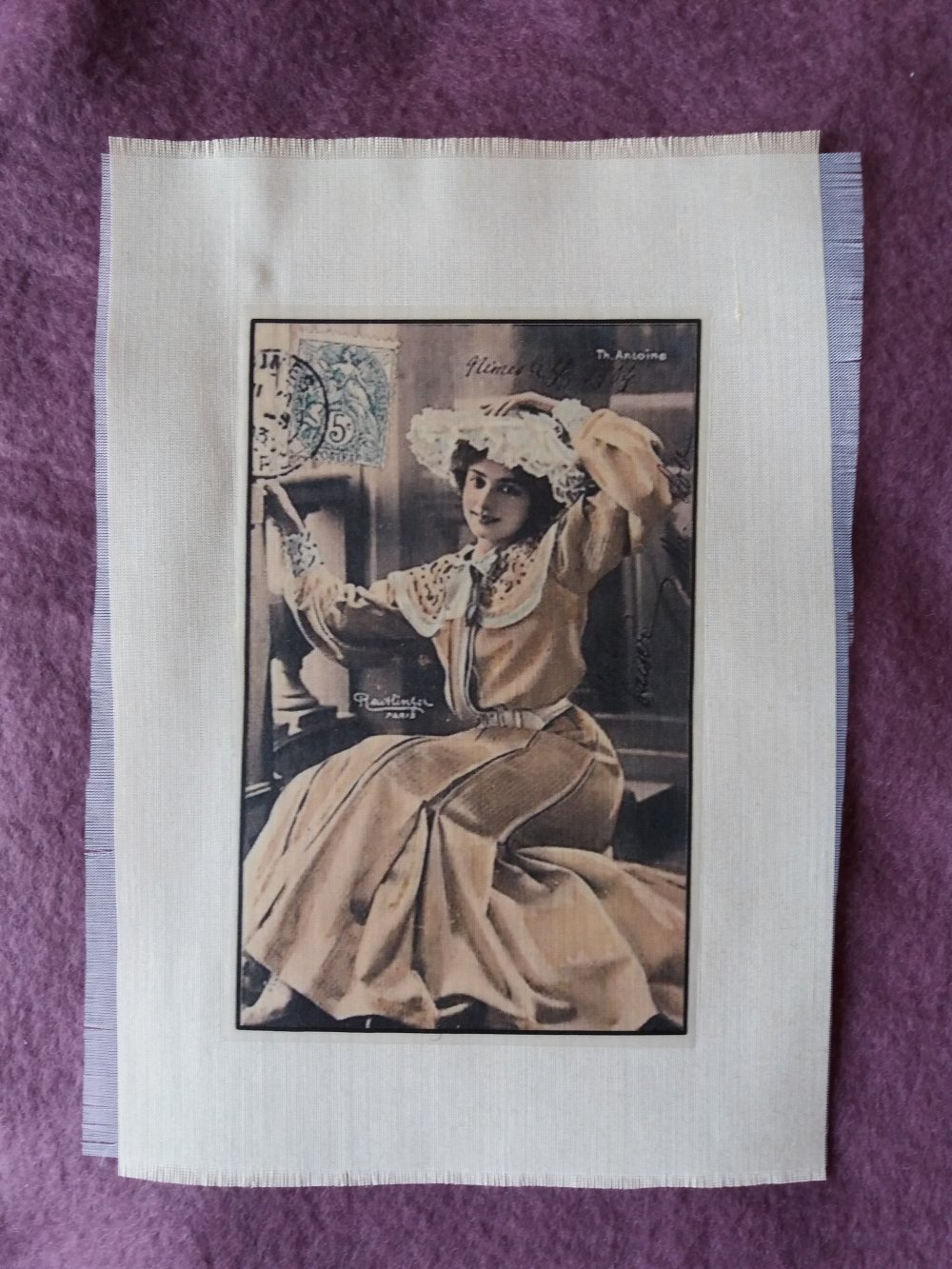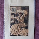 Je vous propose ce transfert d'une illustration ancienne représentant une jeune femme assise, avec robe jaune et chapeau, transférée sur un tissu en coton jaune pâle assez fin. Aspect légèrement plastifié (le transfert laisse une fine pellicule sur l'image).