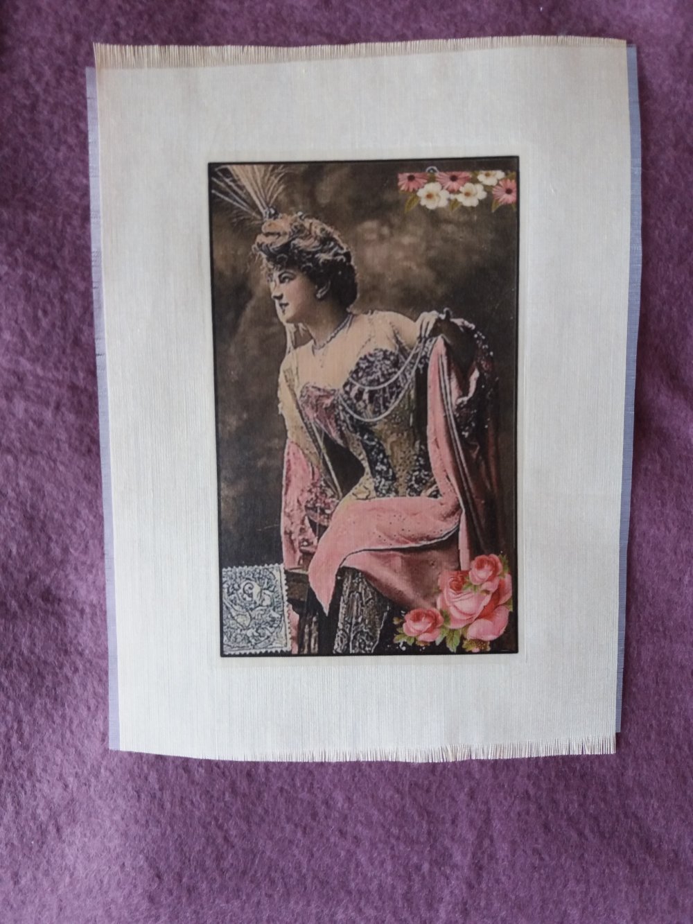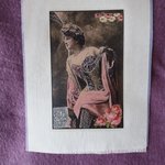 Je vous propose ce transfert d'une illustration ancienne représentant une jeune femme élégante, en robe rose, transférée sur un tissu en coton jaune pâle assez fin. Aspect légèrement plastifié (le transfert laisse une fine pellicule sur l'image).