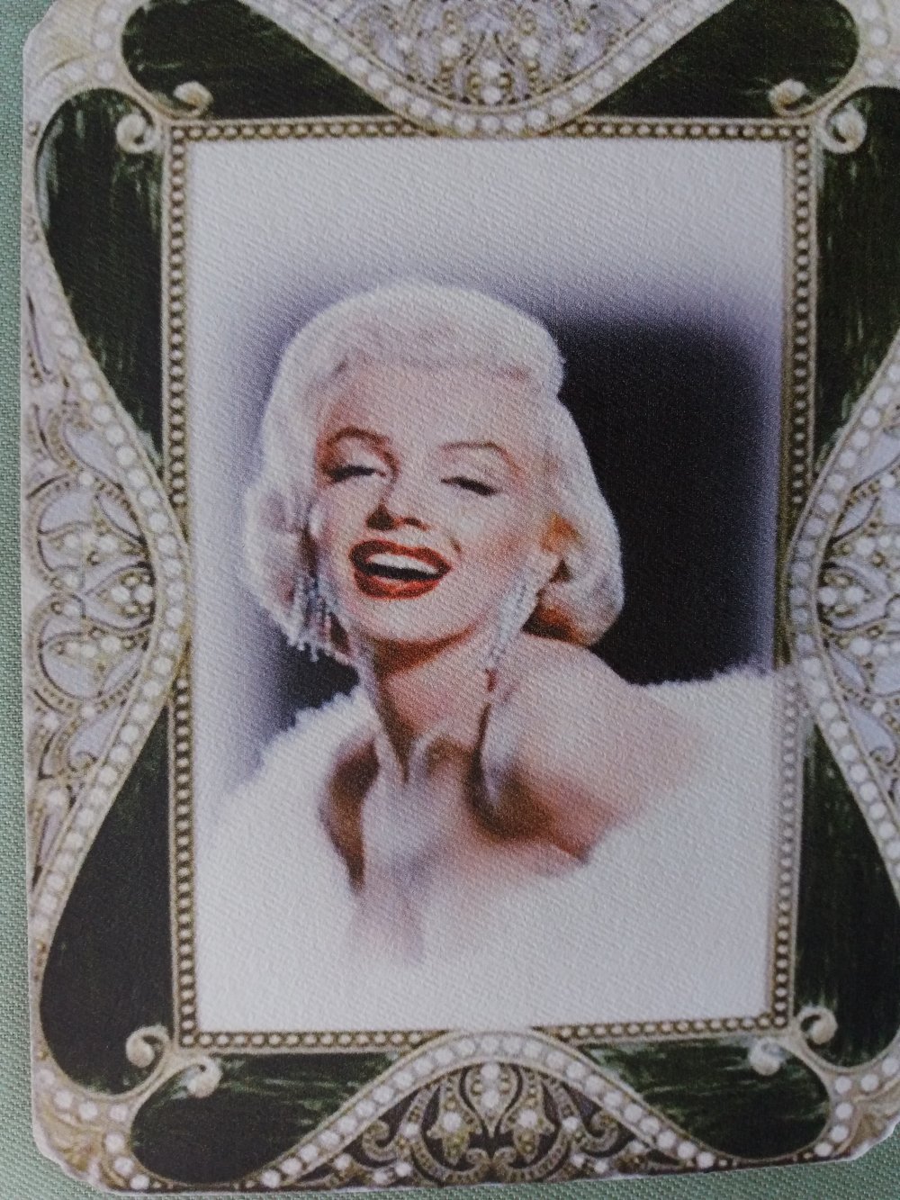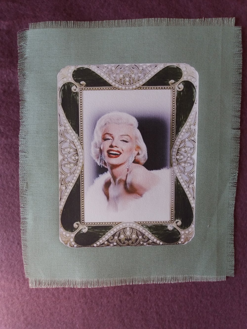 Jolie illustration de Marilyn Monroe, dans un cadre luxueux, transférée sur un tissu en coton couleur verte. Un superbe portrait dans un superbe cadre digne de l'interprète de "Comment épouser un millionnaire";