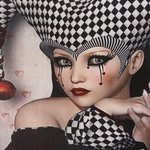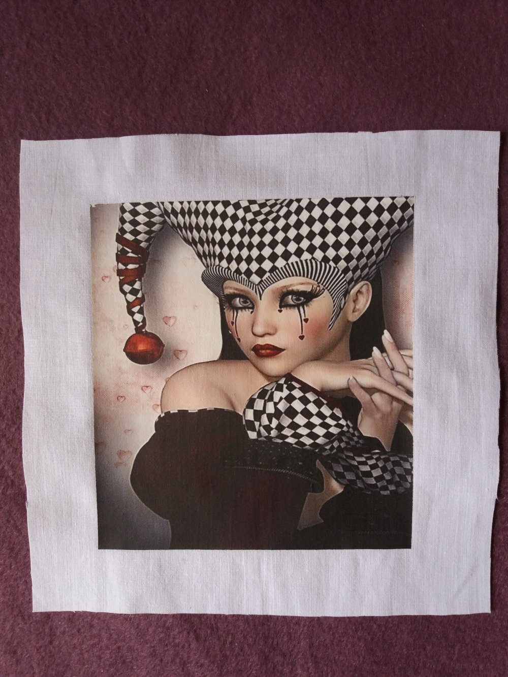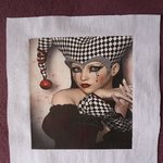 Illustration d'un beau visage pouvant s'inspirer de l'univers "Commedia dell'Arte", transférée sur un tissu en coton blanc.