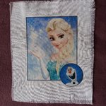 Transfert d'une image représentant un personnage dessin animé, reine ou princesse, effectué sur un tissu fin en coton blanc. Légèrement plastifié (le transfert laisse une fine pellicule sur l'image).