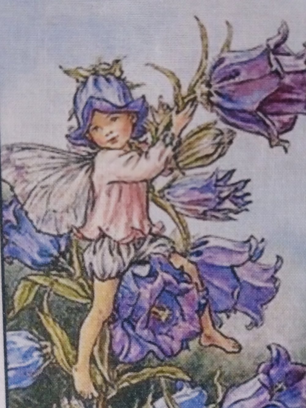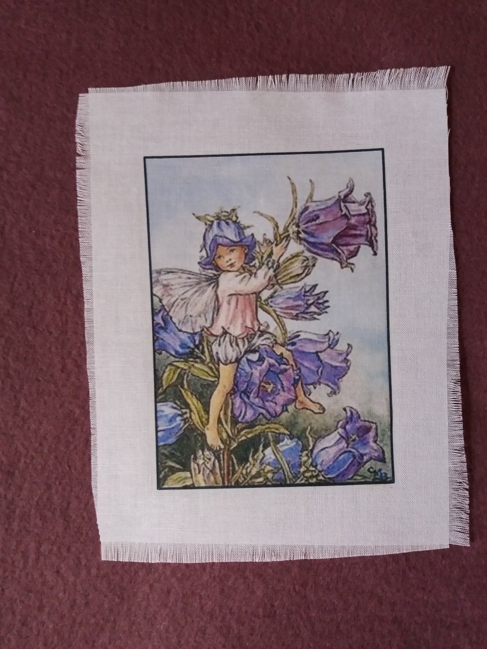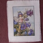 Illustration petite fée bleue transférée sur tissu coton blanc