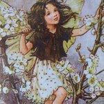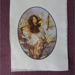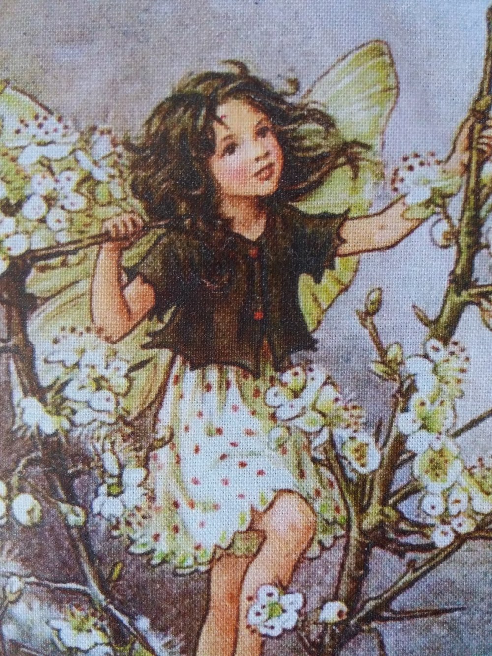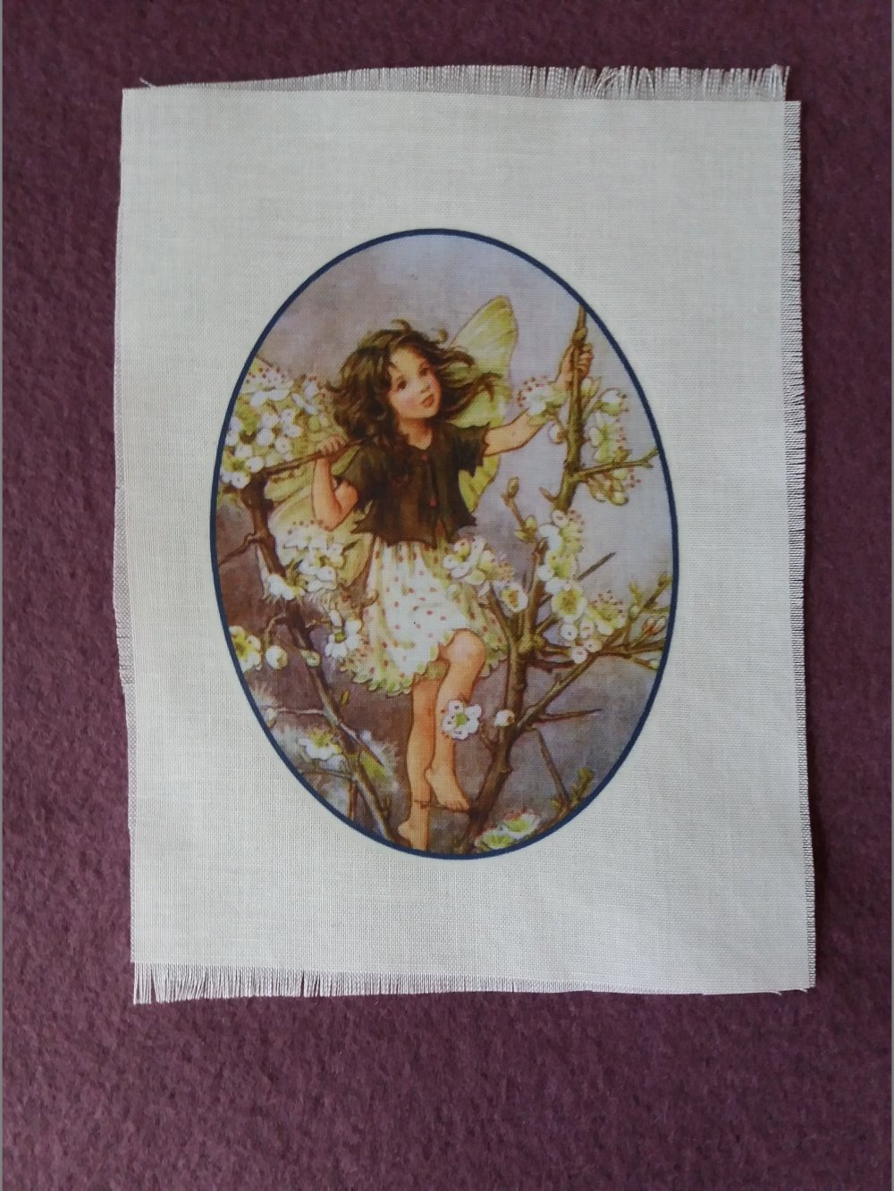 Illustration petite fée fleurettes blanches transférée sur tissu coton écru