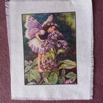 Illustration petite fée lilas transférée sur tissu coton blanc