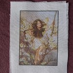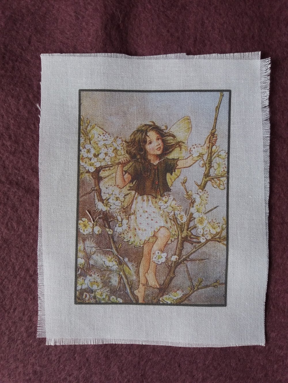 Je vous propose ce transfert d'une image représentant une adorable petite fée entourée de fleurettes blanches imprimée sur un tissu fin en coton blanc.