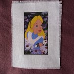 Petit transfert d'une image représentant une petite fille blonde parmi les fleurs, personnage de dessin animé, effectué sur un tissu en coton blanc. Légèrement plastifié (le transfert laisse une fine pellicule sur l'image).