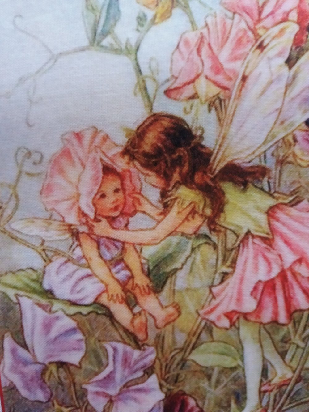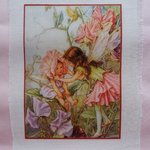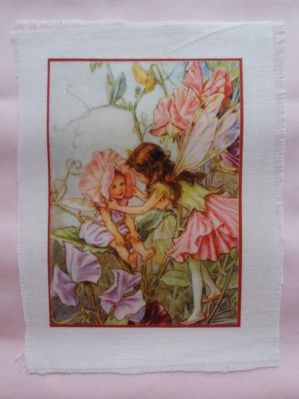 Joli transfert d'adorables petites fées fleurs, effectué sur un tissu fin en coton écru. Aspect légèrement plastifié (le transfert laisse une légère pellicule sur l'image).