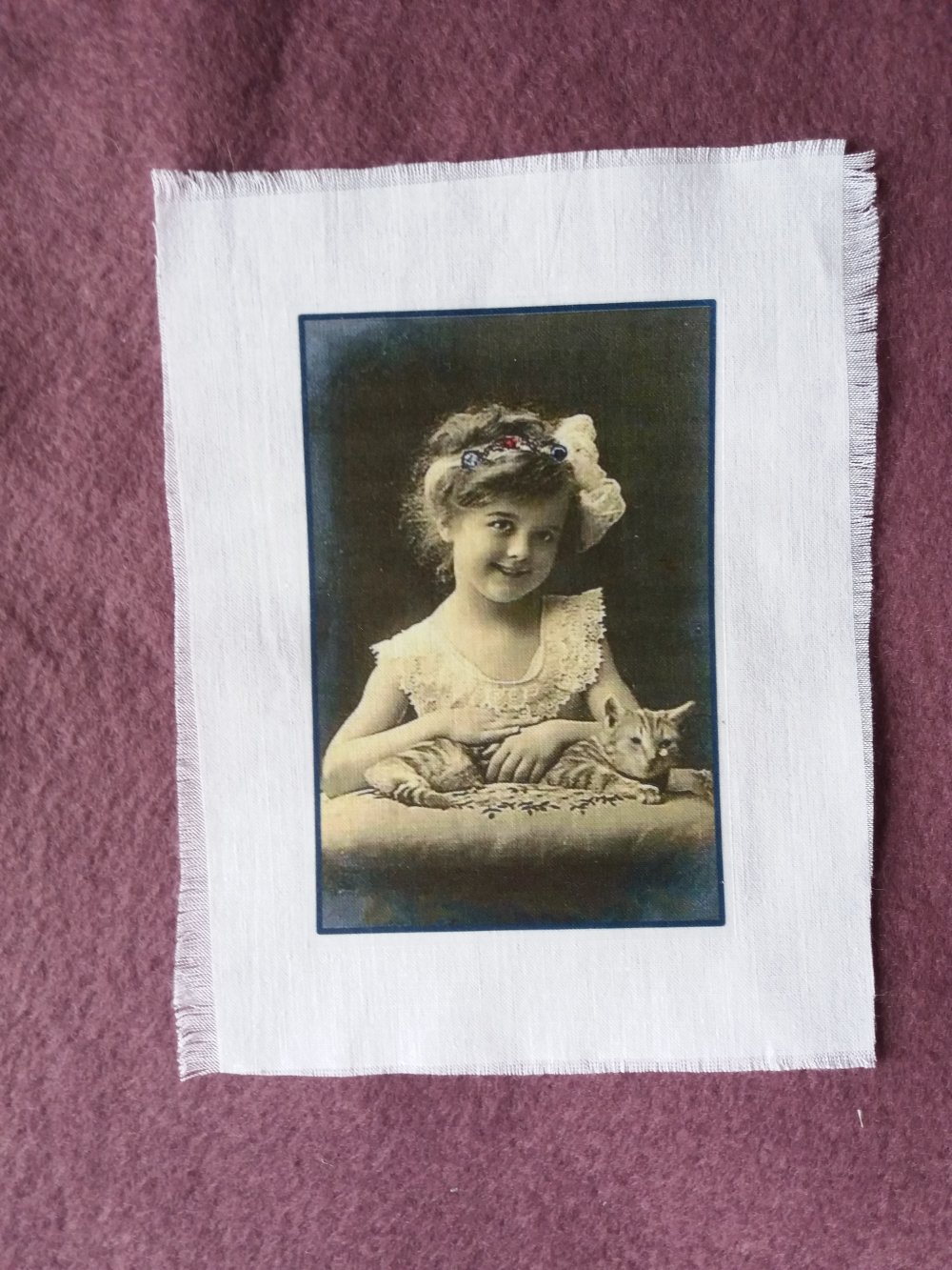 Illustration d'une fillette rétro avec petit chat transférée sur tissu coton blanc