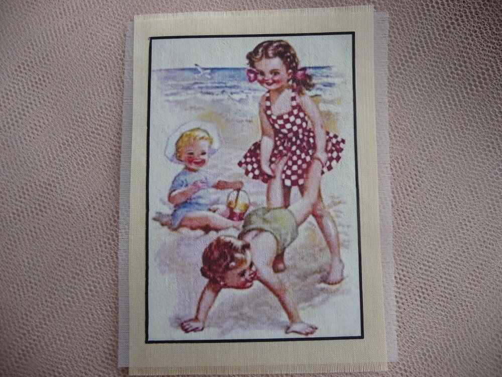 Je vous propose ce transfert d'une image ancienne représentant d'adorables enfants jouant sur la plage transférée sur un tissu fin en coton jaune.