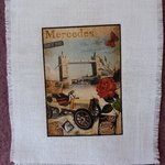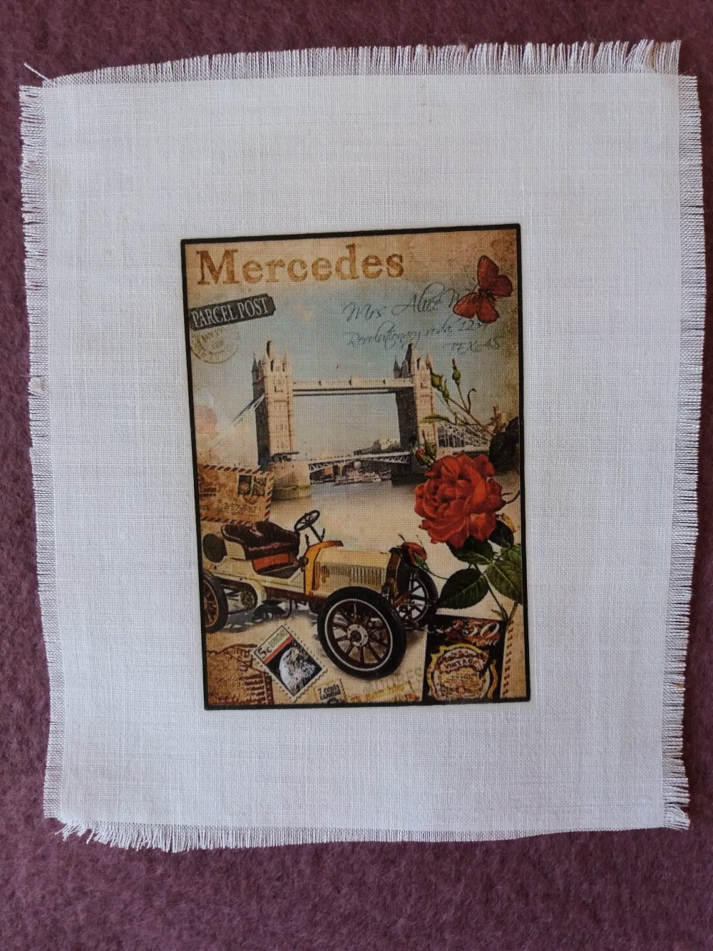 Je vous propose une petite illustration avec véhicule ancien, pont, fleurs, petites inscriptions, ... transférée sur tissu en coton blanc.Aspect légèrement plastifié