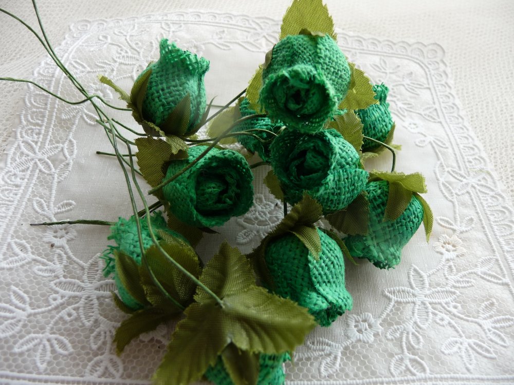 Ensemble de 10 roses en tissu rigide, aspect filet, couleur vert avec feuillage vert tendre.
