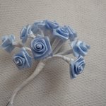 Lot de 12 mini roses en tissu satiné, couleur bleu-ciel, tige en métal recouvert de papier blanc.