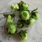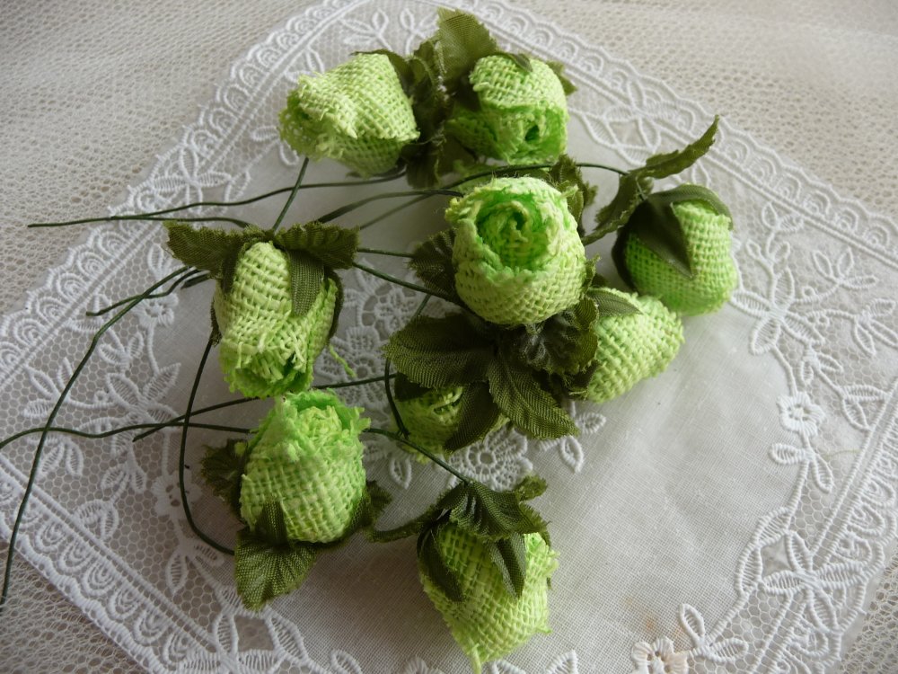 Ensemble de 10 roses en tissu rigide, aspect filet, couleur vert pomme, avec feuillage vert tendre.