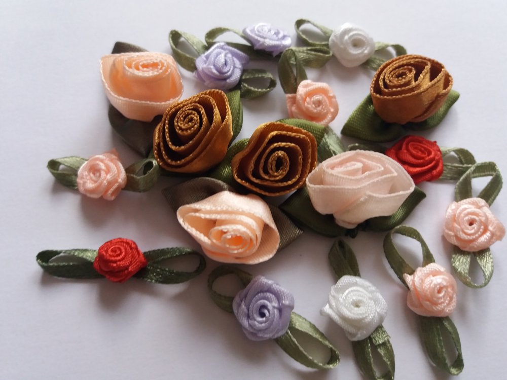 Voici un bel ensemble de roses en satin, couleurs variées, 2 tailles, pour finaliser et embellir vos projets créatifs, fêtes, décoration florale, couture, scrapbooking, collage, customisation, mixed-media, mariage, ...