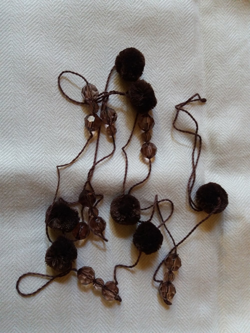 Petite guirlande décorative, à suspendre, composée de pompons et perles à facettes marron.