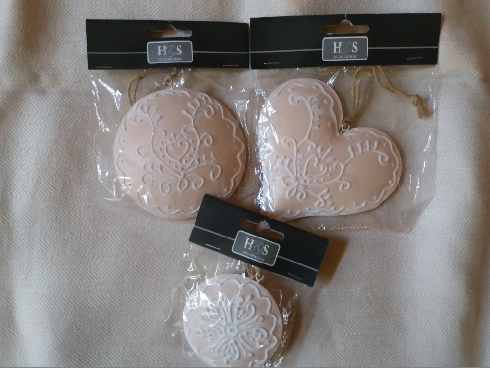 3 décorations coeurs en métal décoré, aspect cérusé, avec cordelette ficelle pour suspension.