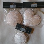 3 décorations coeurs en métal décoré, aspect cérusé, avec cordelette ficelle pour suspension.
