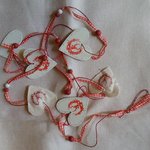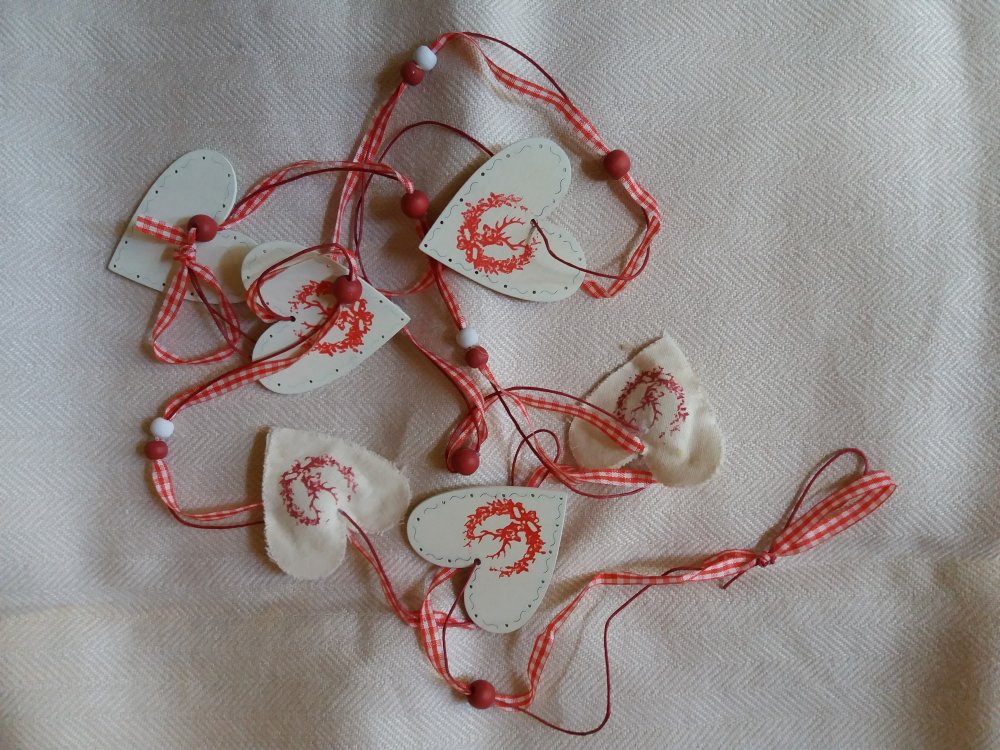 Jolie petite guirlande légère, composée d'un fil coton ciré, ruban vichy rouge, de 4 coeurs en bois décorés de 2 coeurs en tissu décorés.