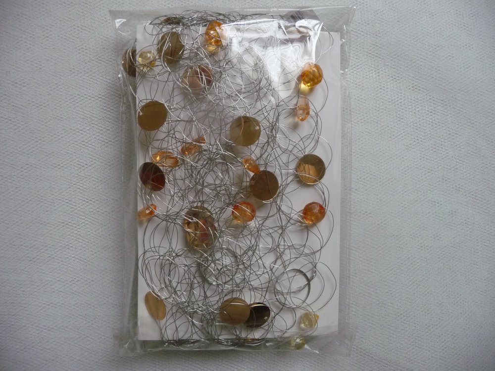 Jolie guirlande composée de fil métal sur lequel sont réparties des perles jaunes ( clair et foncé) en plastique (tailles et formes différentes) et des pastilles façon sequins (couleur dorée) de tailles variées (1,5 cm à 3 cm de diamètre).