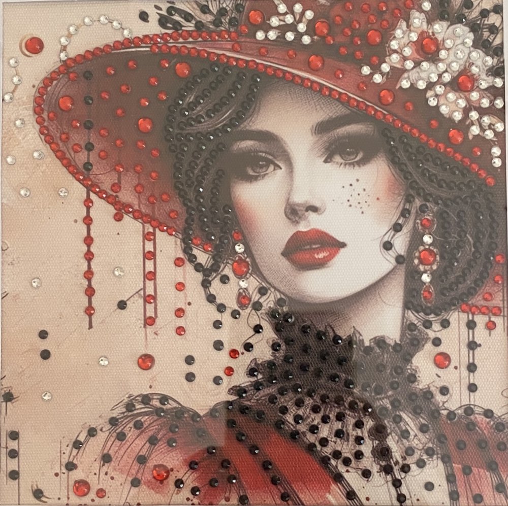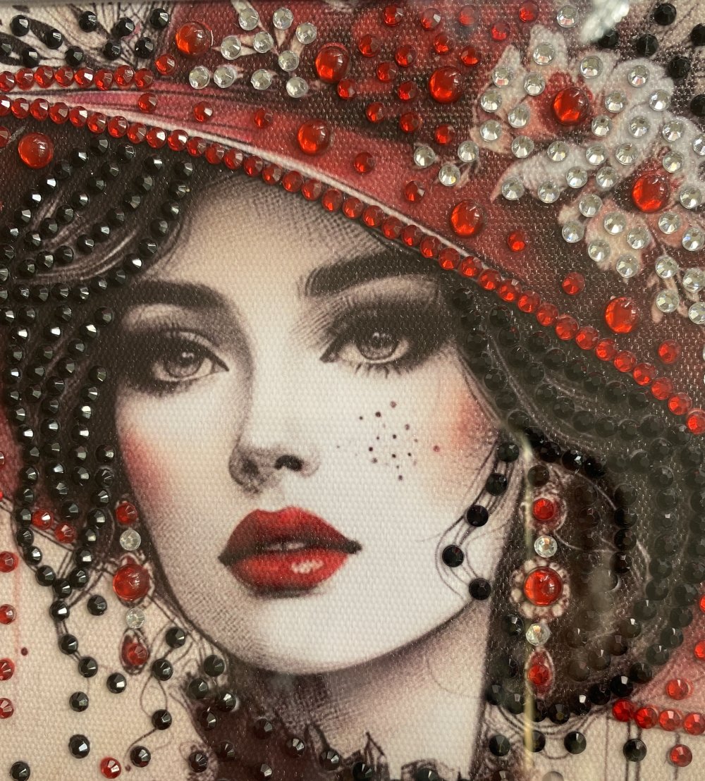 - Superbe tableau diamants painting plein de charme et de caractère, très détaillé et coloré, illustrant une femme raffinée au chapeau rouge. Il est sublimé par de magnifiques strass rouges et noirs. Le regard intense et la touche rétro en font une oeuvre captivante et glamour. Les strass multicolores ainsi que les perles, posés partiellement, font briller la scène avec raffinement. A savoir : Reflets plus brillants au naturel.