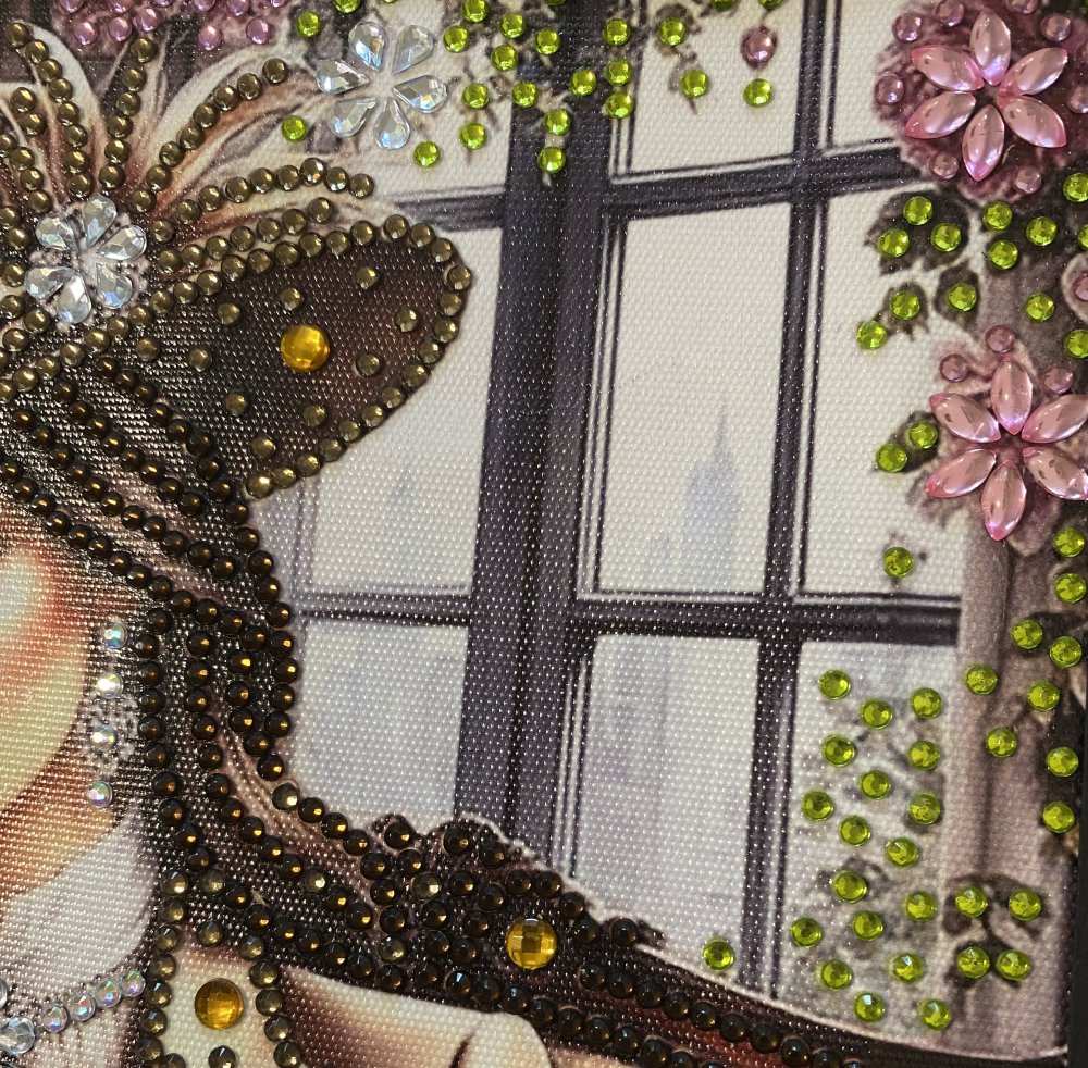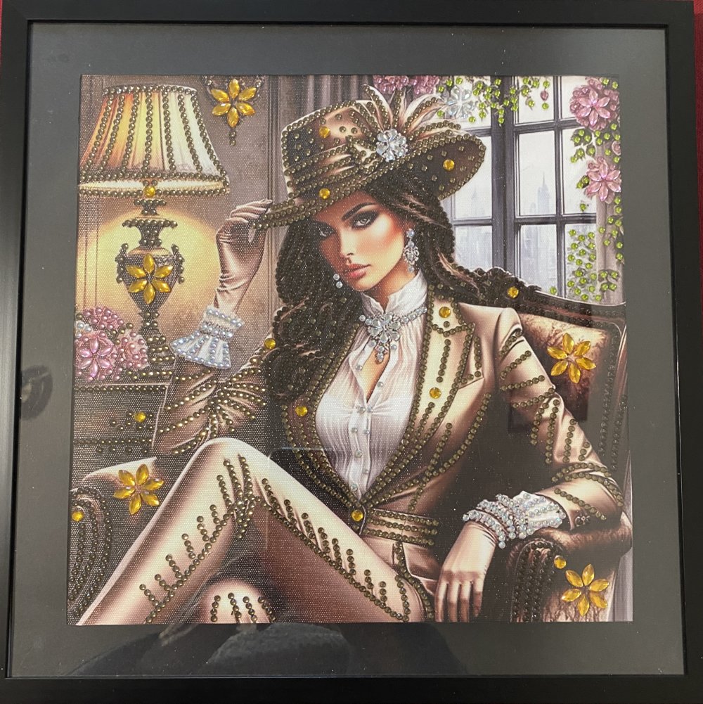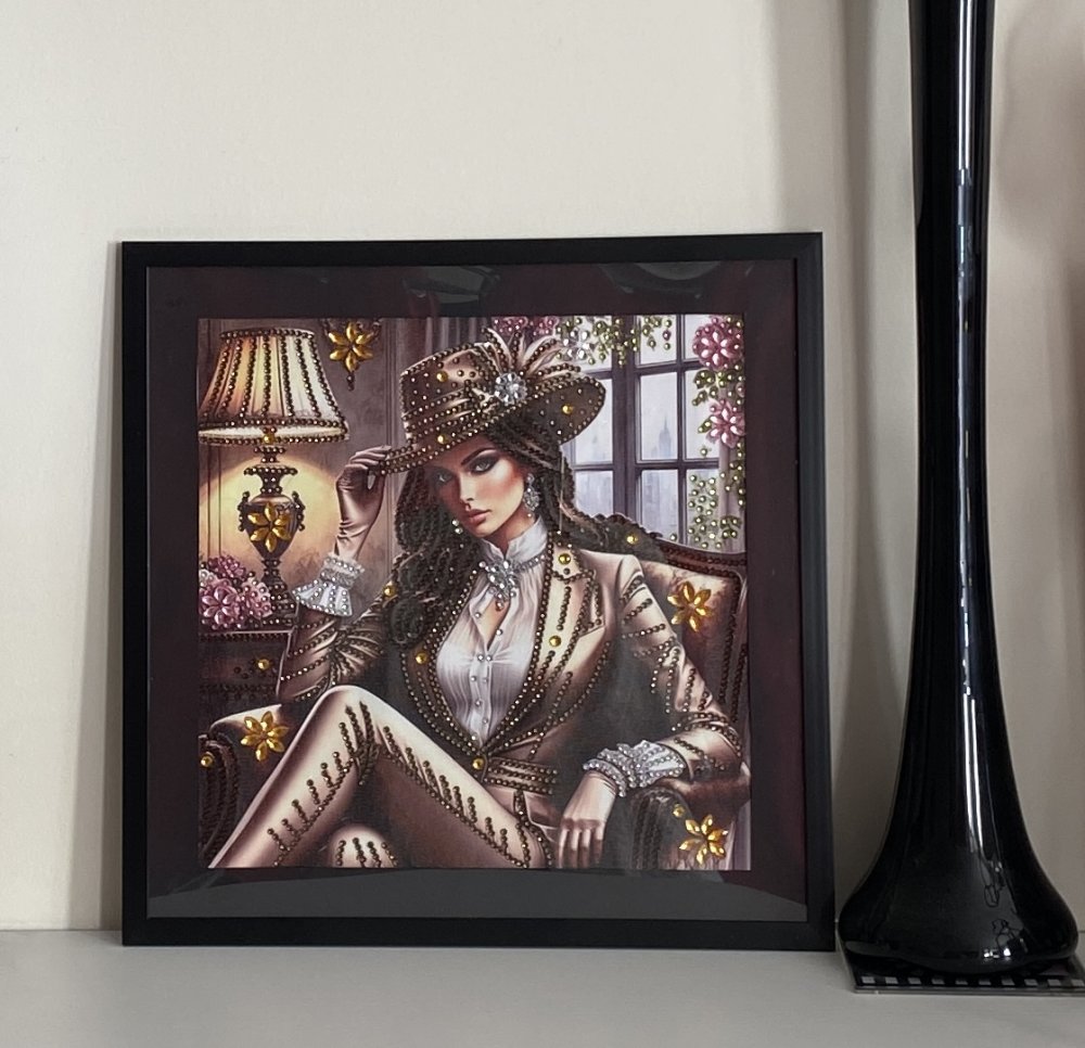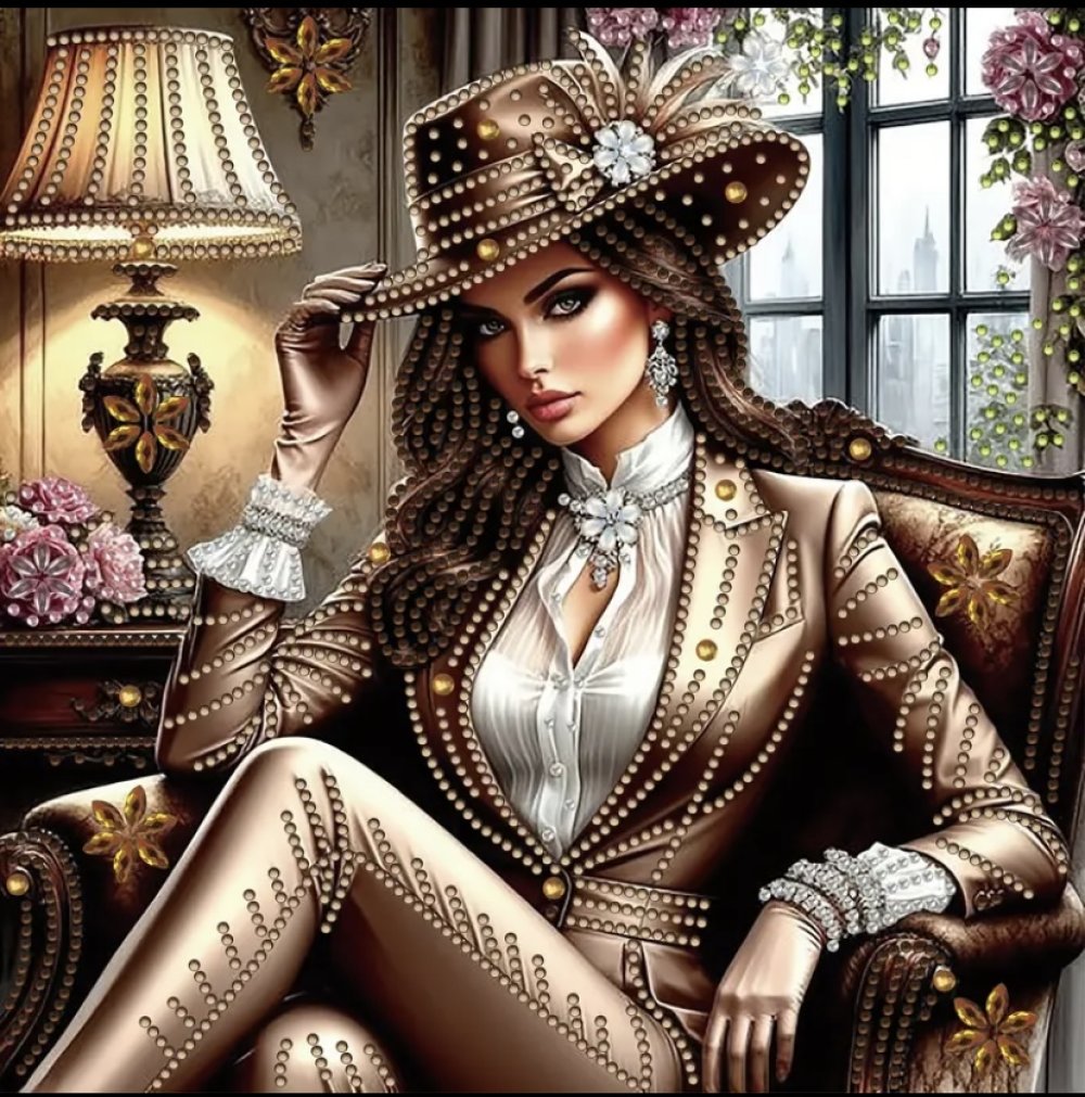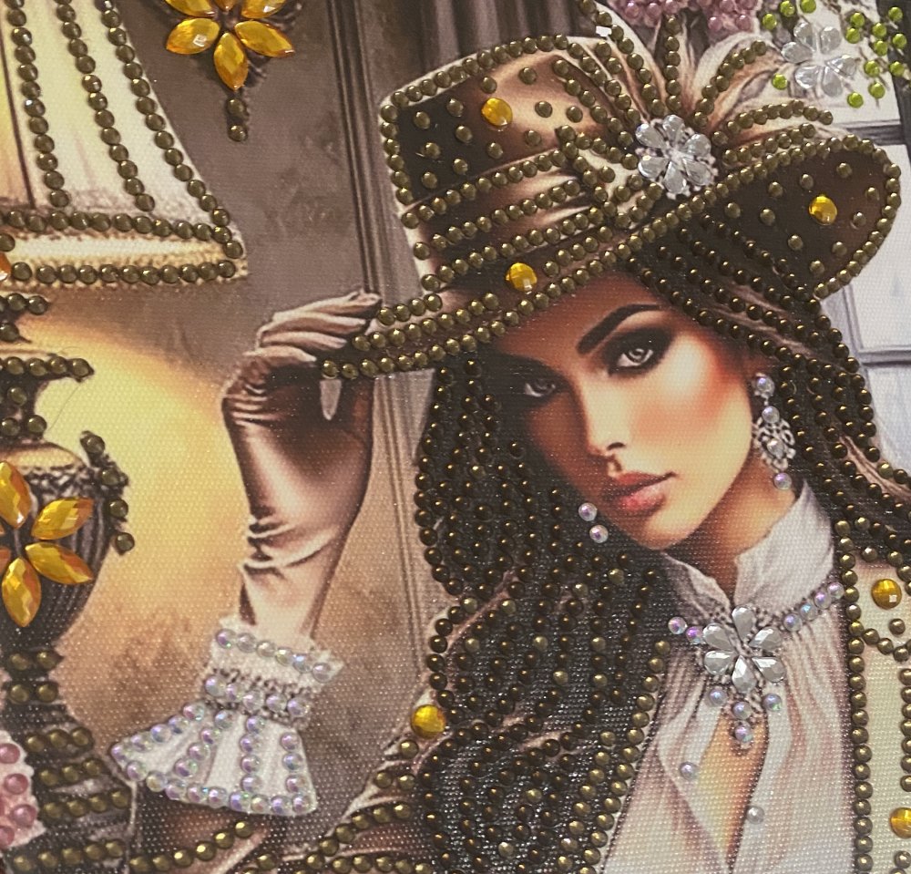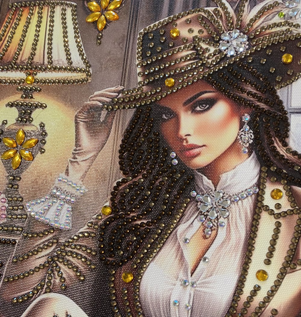 - Elégant tableau diamants painting, très détaillé et coloré, illustrant une femme au regard assuré, vêtue d'un costume raffiné et d'un chapeau orné de strass étincelants. Ce tableau au style vintage allie charme rétro et éclat moderne. Les strass ainsi que les perles, posés partiellement, créent un effet raffiné et chic. A savoir : Reflets plus brillants au naturel.