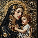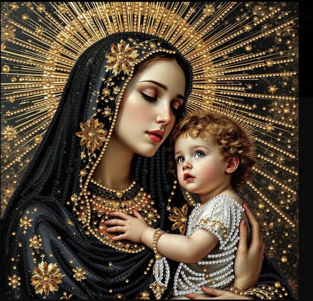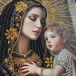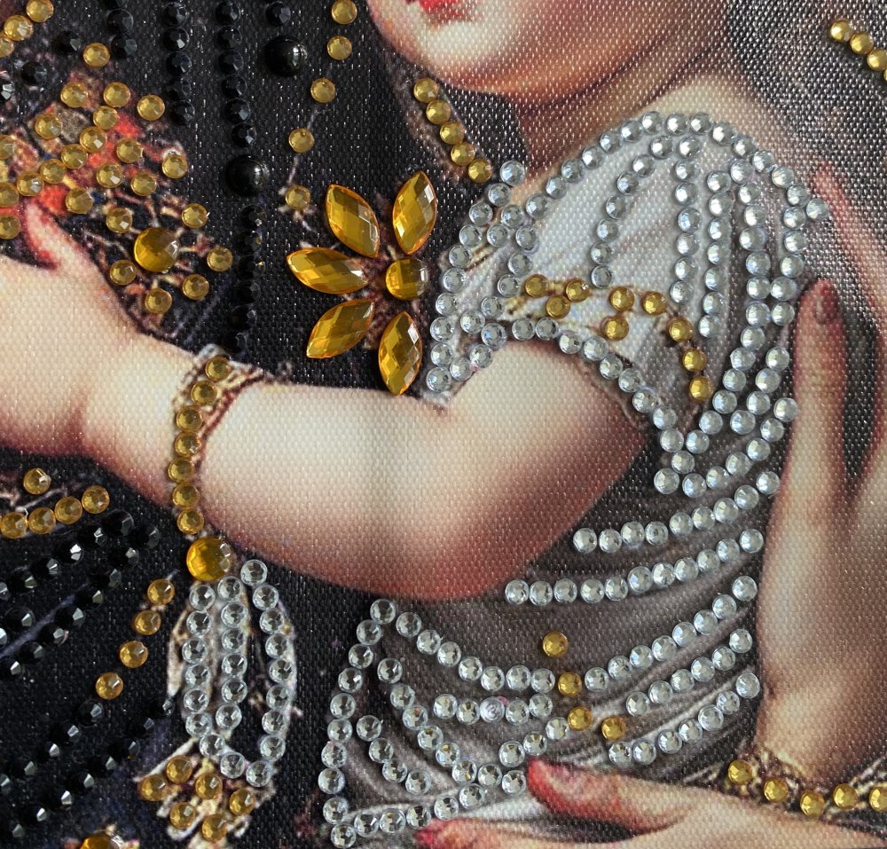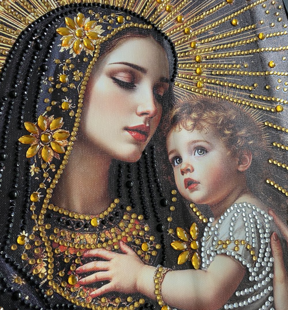 - Tableau diamants painting lumineux, très détaillé et coloré, illustrant une mère et son enfant, Marie portant Jésus entourés d'un halo doré. Les strass ainsi que les perles, posés partiellement, créent les détails fins et les reflets scintillants. A savoir : Reflets plus brillants au naturel.