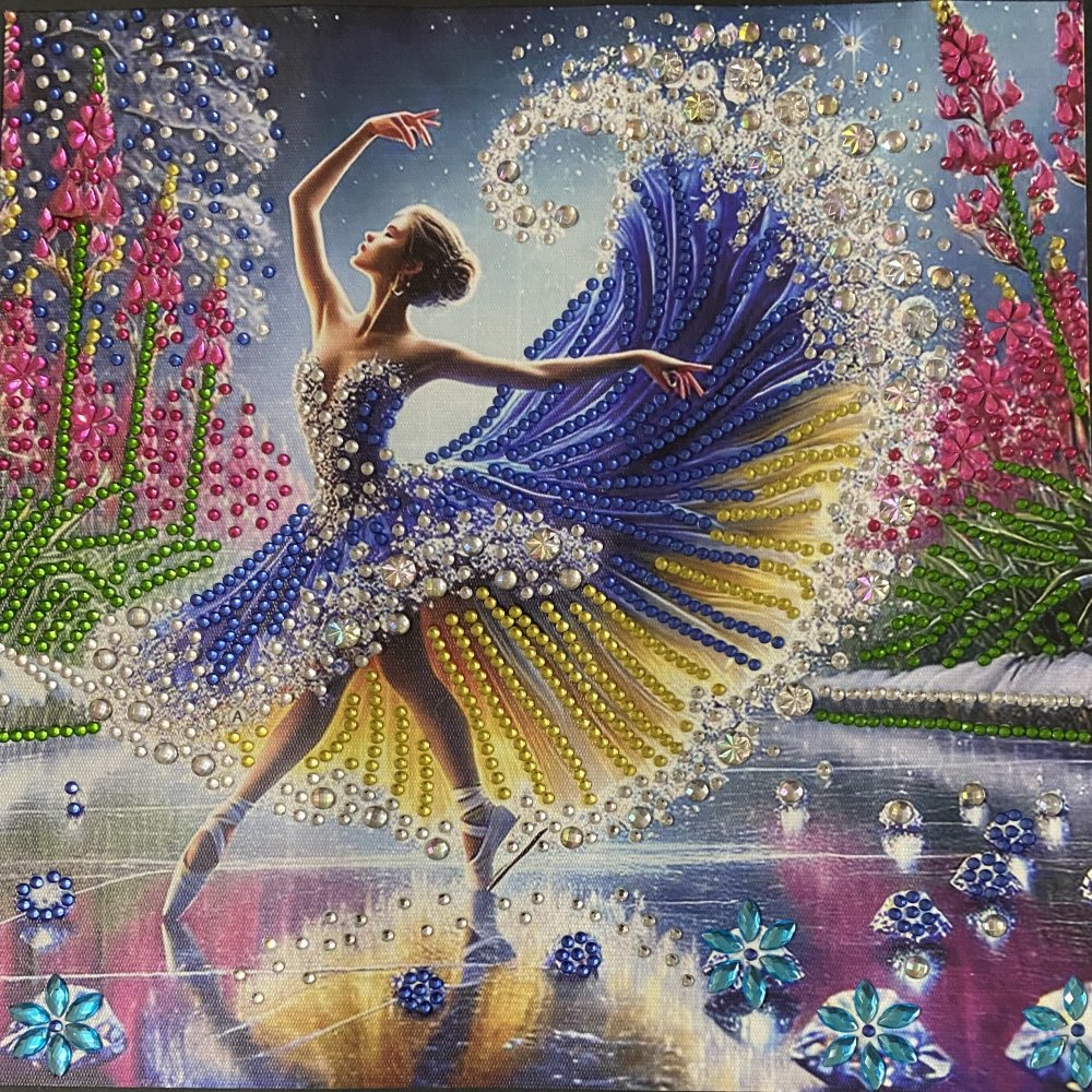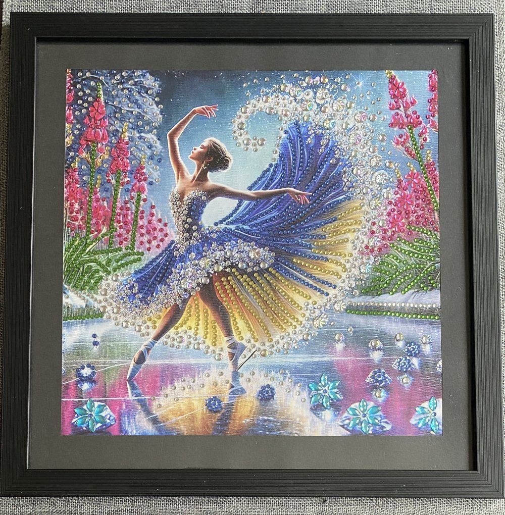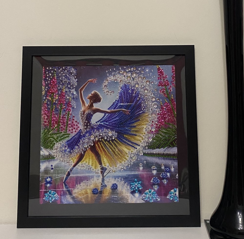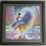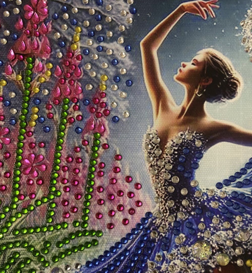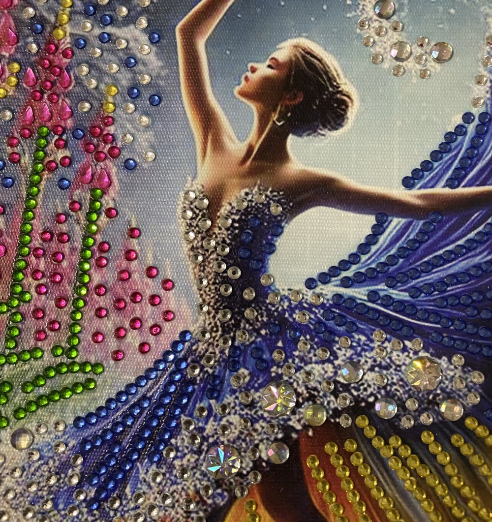 - Ce tableau représente une ballerine en plein mouvement, auréolée d'un tourbillon de couleurs et d'éclats lumineux. Laissez entrer la poésie et la grâce de ce magnifique tableau. Chaque strass a été posé avec soin pour créer un jeu de lumière spectaculaire : la robe semble vibrer entre nuance de bleu, or et cristal brillant, tandis que l'arrière-plan scintille comme un décor féérique. La scène évoque à la fois la légèreté et un souffle de magie - un véritable instant suspendu. Les strass ainsi que les perles, posés partiellement permettent à chaque détail de briller avec élégance et révèle le soin minutieux du travail artisanal. A savoir : Reflets plus brillants au naturel.