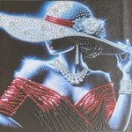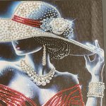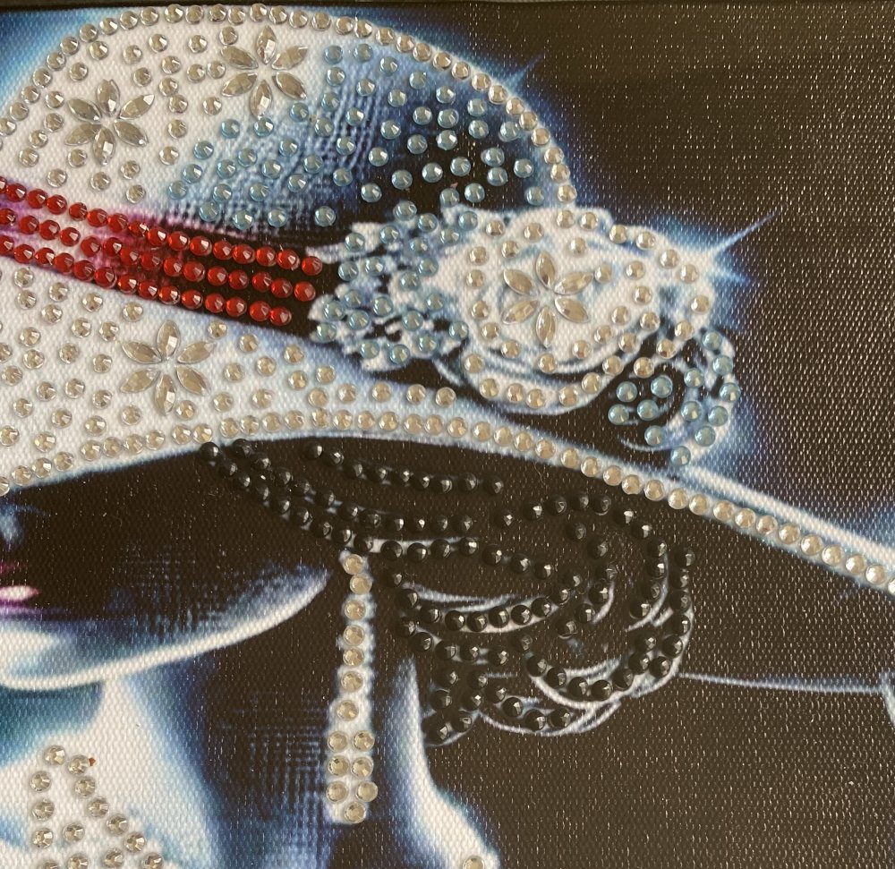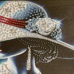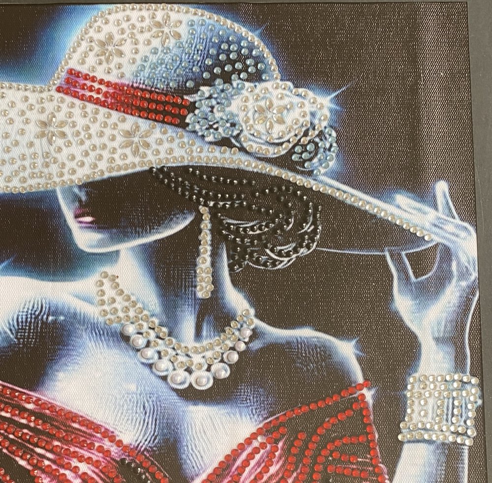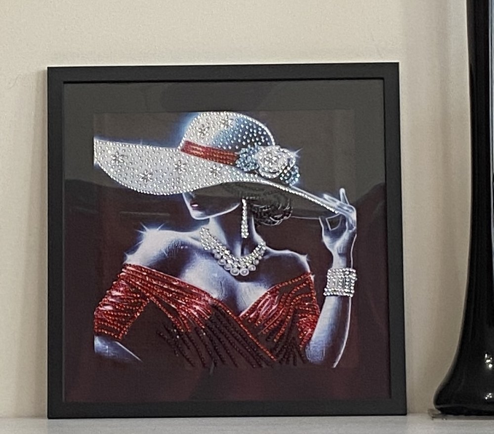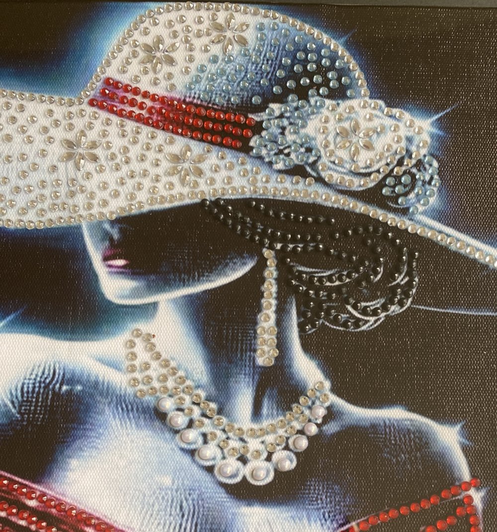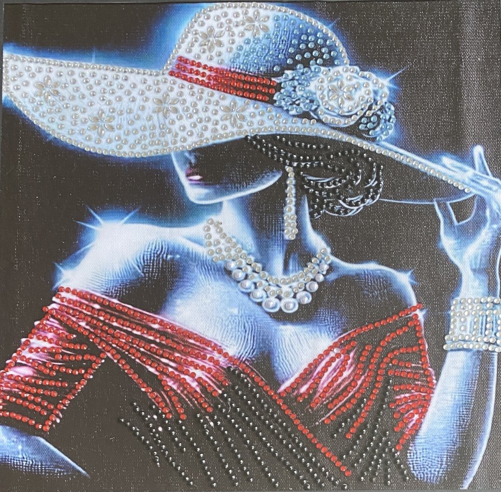 - Ce tableau captivant représente une femme mystérieuse, drapée de lumière et de glamour. Son large chapeau orné de strass scintillants, son collier de perles et sa robe aux reflets rouges composent une scène d'une élégance rare. Chaque détail évoque le luxe, la féminité et la sophistication, comme si la silhouette sortait tout droit d'un rêve de haute couture. Les strass ainsi que les perles, posés partiellement permettent à chaque détail de briller avec élégance et révèle le soin minutieux du travail artisanal. A savoir : Reflets plus brillants au naturel.