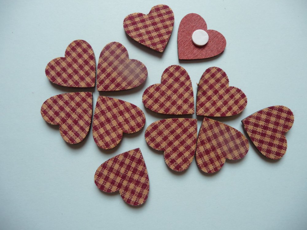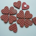 12 PETITS COEURS EN BOIS TISSU VICHY GRENAT