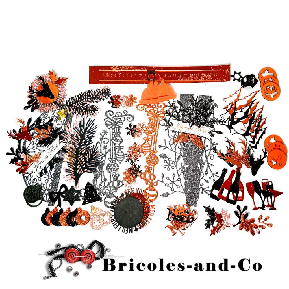 -1 règle compteur Noel 18cmx1.5cm avec passant et 4 marqueurs à coller au choix, 2 champagnes et coupes, flutes, 2 sapins en silhouettes, 2 branches pin grande 10cmx5cm Pt 7cmx4cm, 3 petits flocons, 1 rosette tête de renne 6cm , 1 branchage étiquette, 1 branchage rond étiquette, 3 têtes rennes
