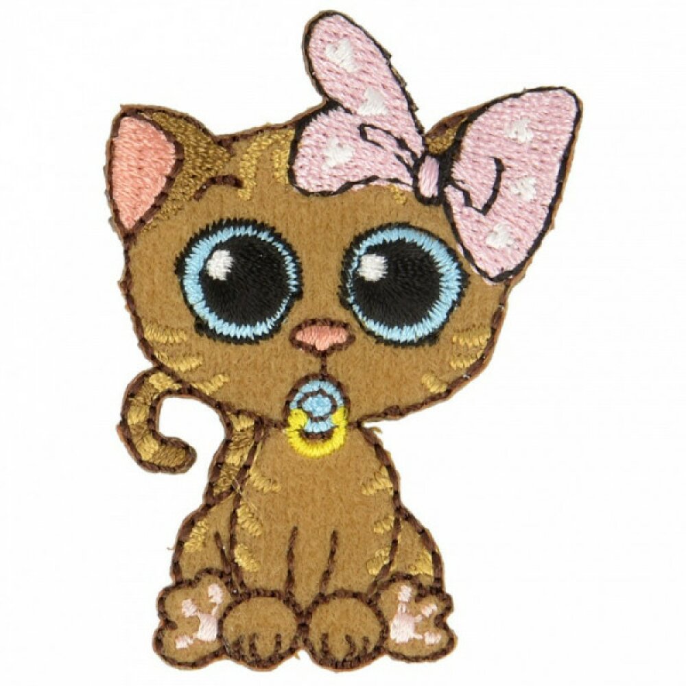 Ecusson thermocollant chat aux gros yeux bébe nœud rose 5 cm x 3,5 cm