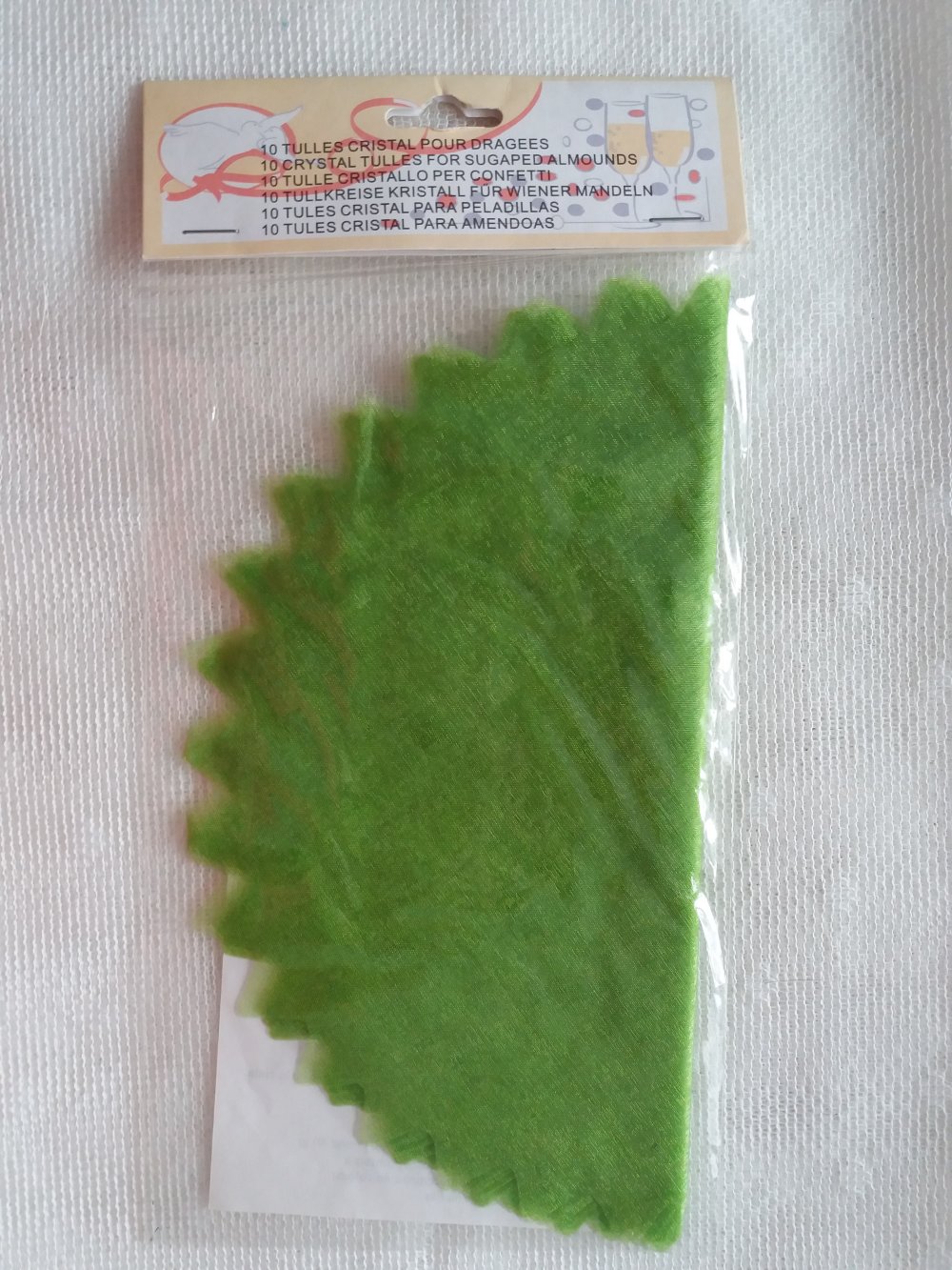 10 ronds en tulle vert de 24 cm de diamètre couleur verte, pour y déposer vos dragées. Vous pouvez finaliser votre présentation en fermant la bonbonnière avec un petit ruban satin, petite cordelette satinée et finir avec une petite fleur ou perle, par exemlple.