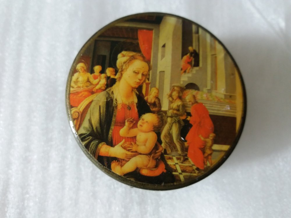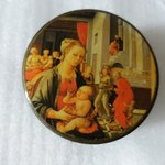 Je vous propose cette petite boite laquée noire, forme ronde, avec illustration religieuse.