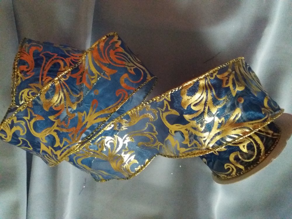 Je vous propose ce ruban grande largeur transparent bleu, avec motifs dorés et bords rigides.