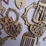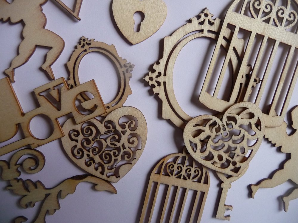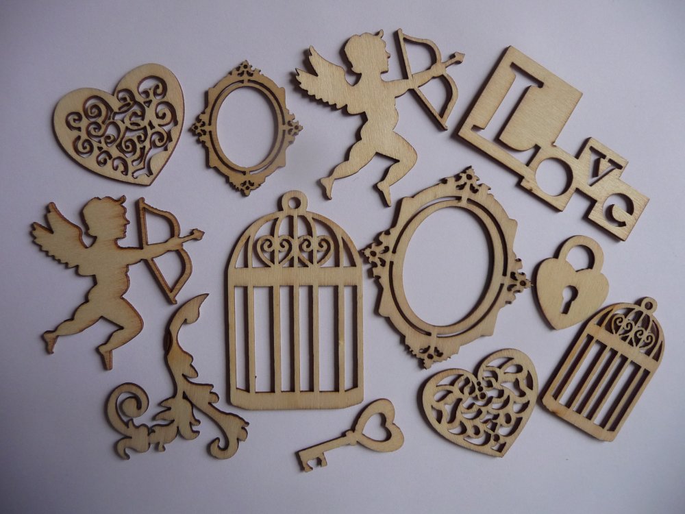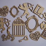 12 petites découpes en bois, motifs variés (angelots, coeurs, cages d'oiseaux, cadres).