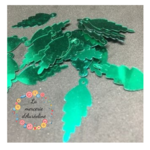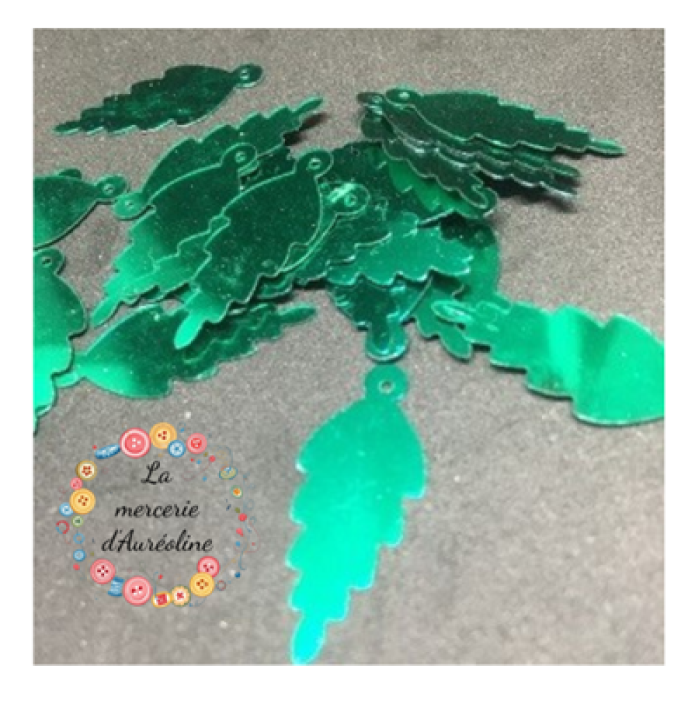 Sachet de 10 grammes de paillettes plates en forme de feuille de couleur verte, facile à utiliser en les collant ou les suspendre grâce au trou en haut de la feuille; Ces paillettes mesurent 25mm de long pour 10mm de large