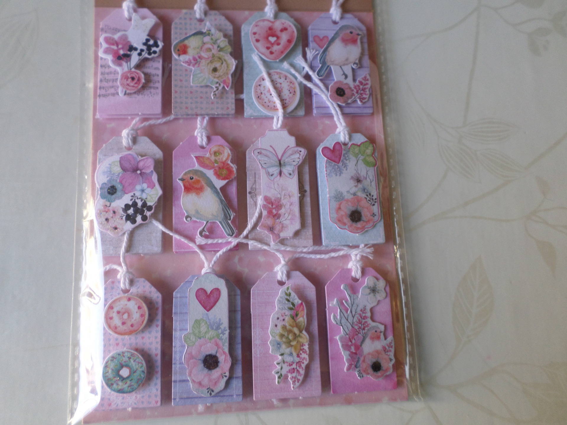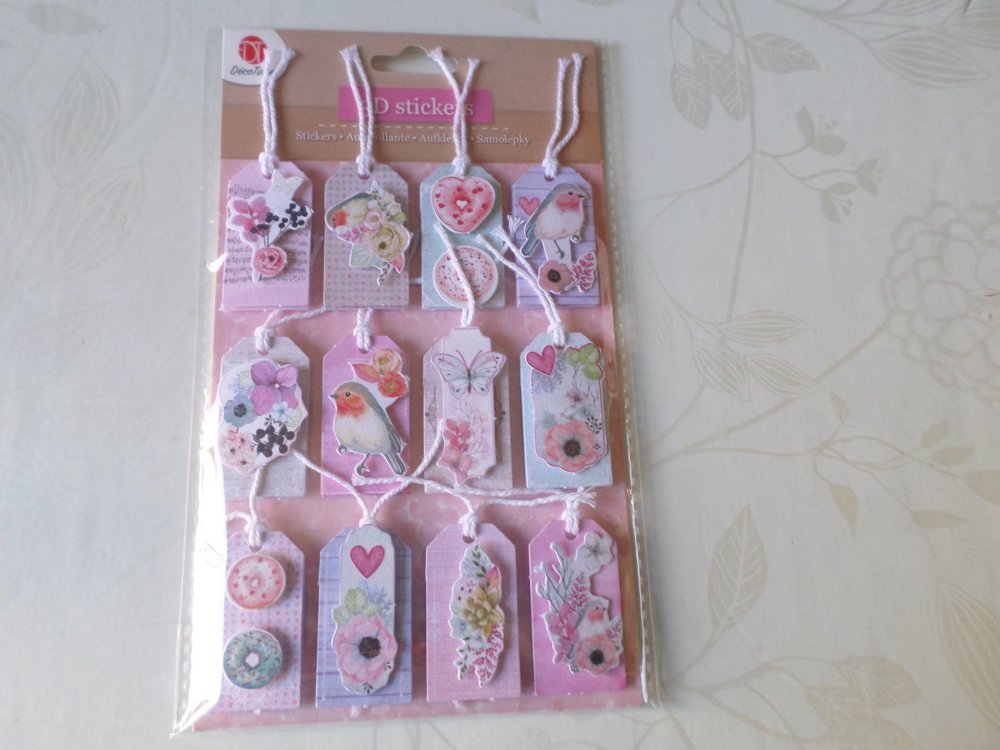 ce très beau lot de 12 mixte stickers autocollants en forme d'étiquettes 3D vintage à motifs fleurs/oiseaux multicolore+cordelette blanche.