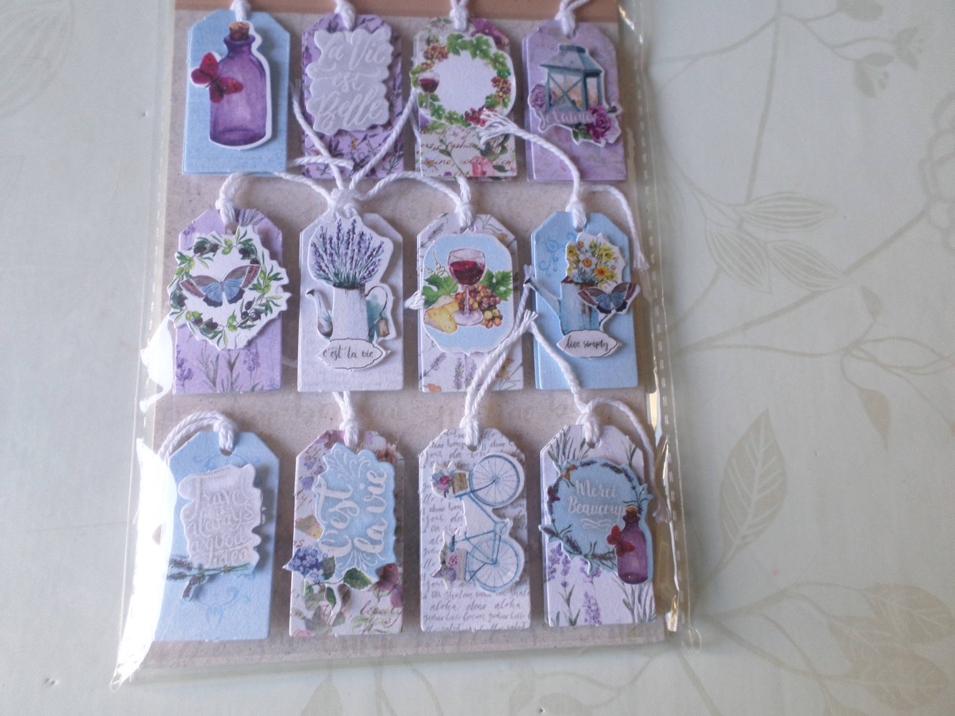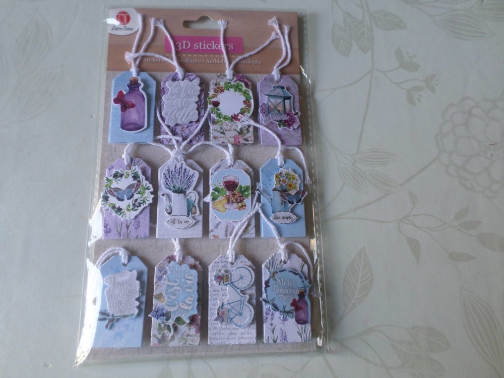 ce très beau lot de 12 mixte stcikers autocollants en forme d'étiquettes 3D vintage à divers motifs multicolore+cordelette blanche.