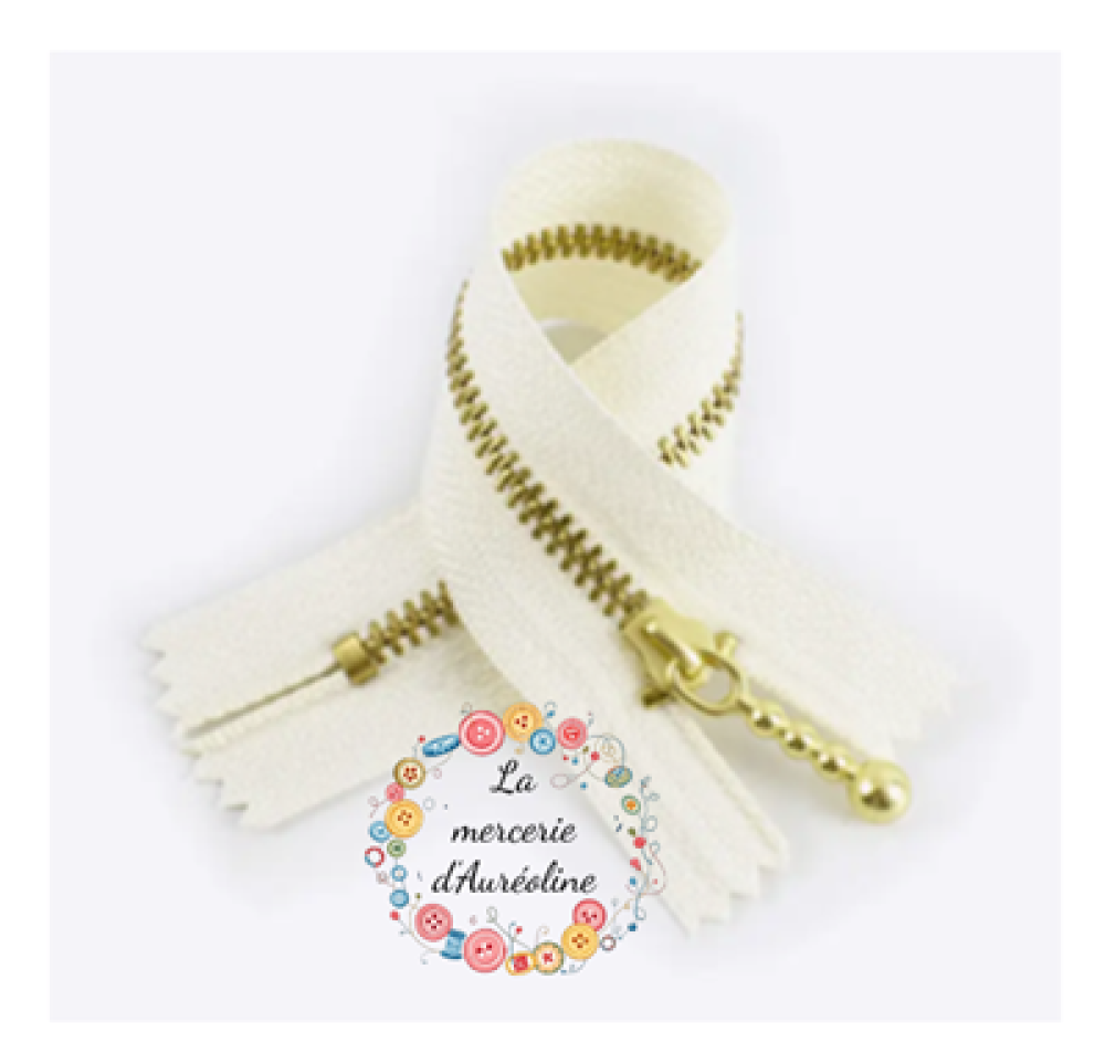 Fermeture éclair/à glissières non séparable de couleur écru, avec un curseur métal doré et une tirette chaine de boules dorées.