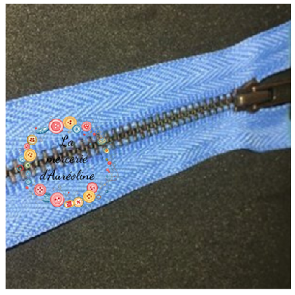 Fermeture à glissières en polyester bleu océan et mailles en métal bronze de 18cm de long