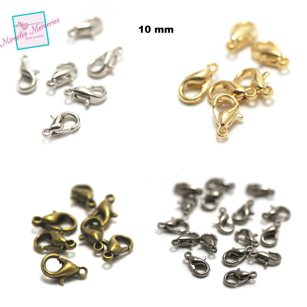 20 fermoirs mousquetons, 10mm, couleurs au choix