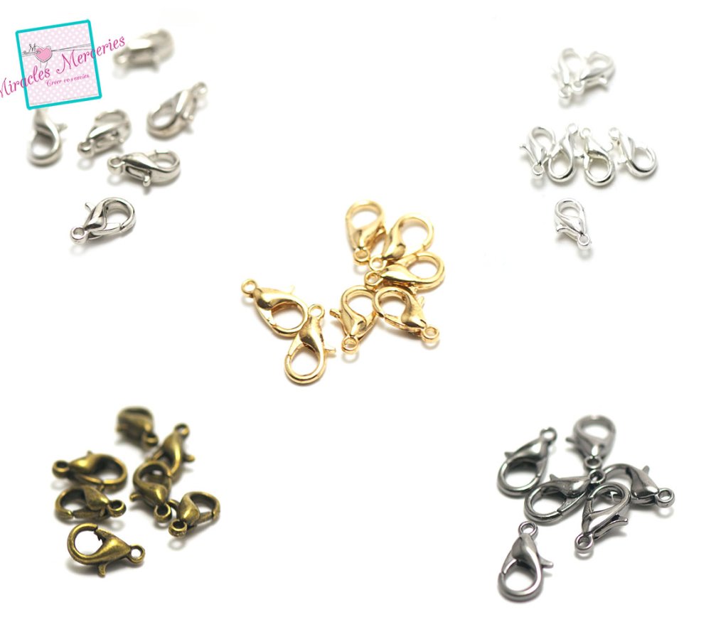 20 fermoirs mousquetons, 12mm, couleurs au choix